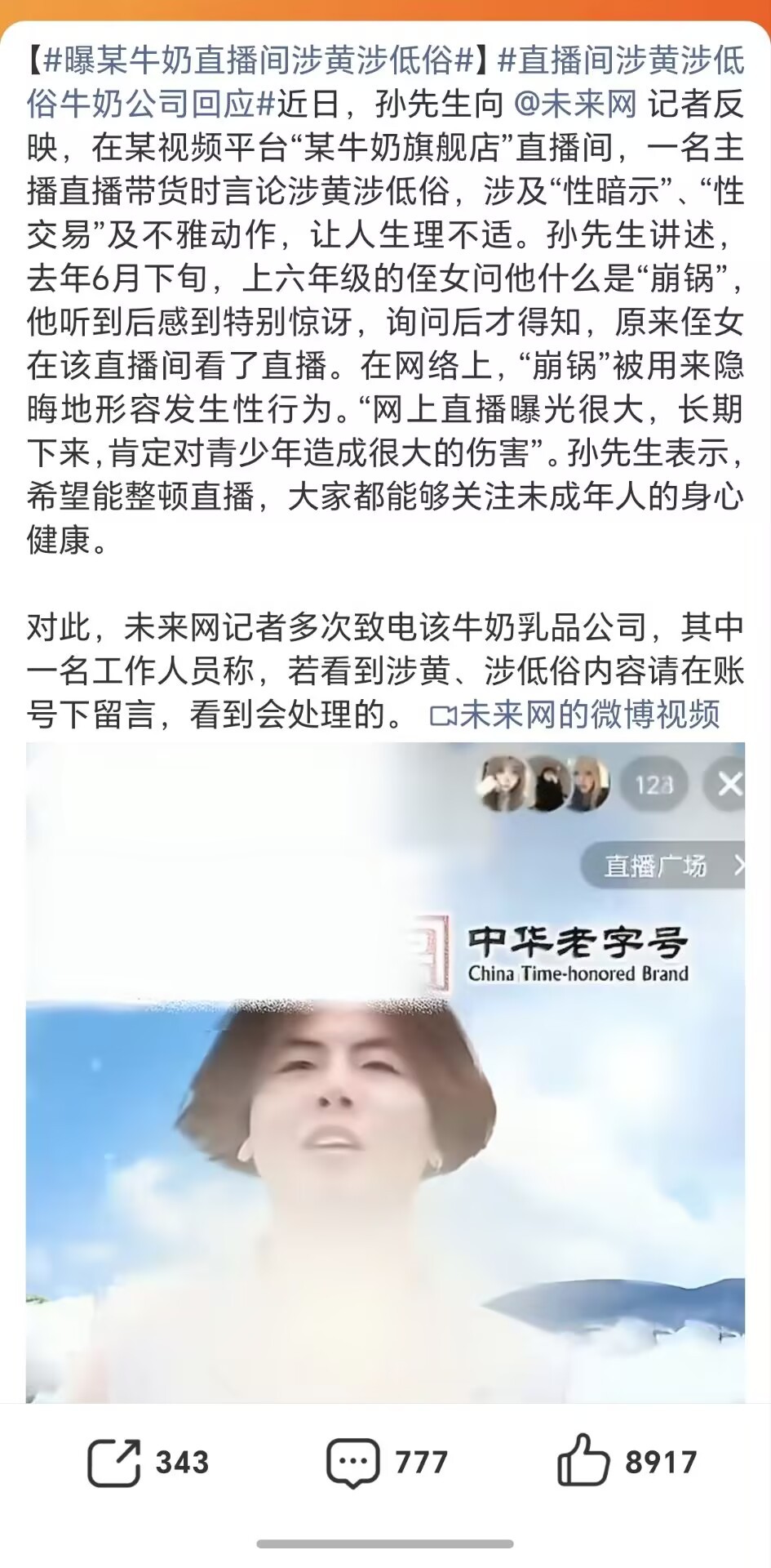 曝某牛奶直播间涉黄涉低俗主打孩子喝的牛奶,直播间主播居然满嘴低俗荤话、做不雅动作,连六年级小学生都刷到,还跑去问家长那些词是什么意思……