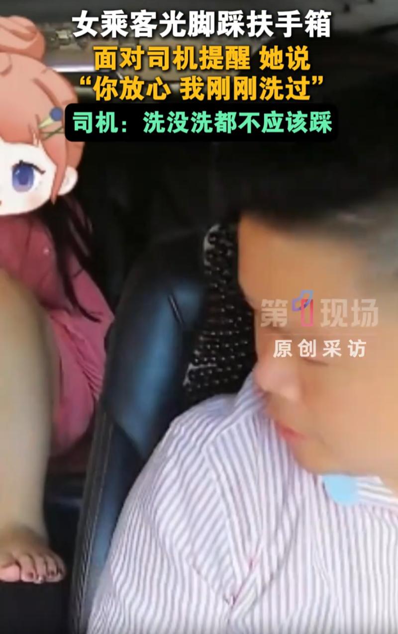 太奇葩了!广东梅州,一男子开网约车拉到了一名女乘客,对方上车后,直接就光脚踩到了扶手箱上面,男子开车时还没注意,后来察觉到不对劲,才发现女乘客的脚就挨着他的胳膊,随后女乘客更是语出惊人 车上监控显示,女乘客当时穿着拖鞋上了后座,车子启动后,她就直接把双脚搭在了扶手箱上面,司机陈先生越开越不对劲,回头一看才发现女子的行为,随后礼貌的提醒了一句“脚啊,脚啊!” 女乘客倒是反应快,立刻把脚缩了回去。但紧接着补了一句,直接把陈先生整不会了。她说:你放心,我这脚刚刚洗了 陈先生表示:你洗不洗也不能放在这里啊 这话说得没毛病。问题的关键根本不是你的脚干不干净,而是这是公共场合,是你坐别人车该有的基本礼貌。把脚搭在扶手箱上,一来不雅观,二来影响司机开车,三来也是对人家的不尊重 洗没洗过,真的不是重点。这事儿发到网上后,评论区也是相当热闹。有人说这女乘客太没边界感,有人调侃说下次是不是得带个脚膜服务,也有司机同行分享自己的遭遇,比这过分的还多得多 其实仔细想想,这位女乘客那句我刚洗过,未必是故意抬杠。她可能真觉得自己做得没什么大不了,甚至还挺讲卫生的。问题恰恰出在这里:她压根没意识到自己的行为有什么不妥 现在不少人出门,把网约车当自家客厅,把司机当透明人。脱鞋的、翘脚的、外放刷短视频的、嗑瓜子撒一地的,甚至在后座剪指甲的都有。好像只要付了车费,这十几分钟里,车里的规矩就得按自己的来 但别忘了,网约车是服务场所,不是私人空间。司机提供服务,乘客支付费用,这中间还有一个东西叫互相尊重。你花钱买的是从A点到B点的运输服务,不是买断司机的好脾气,也不是买在别人车里随心所欲的权利