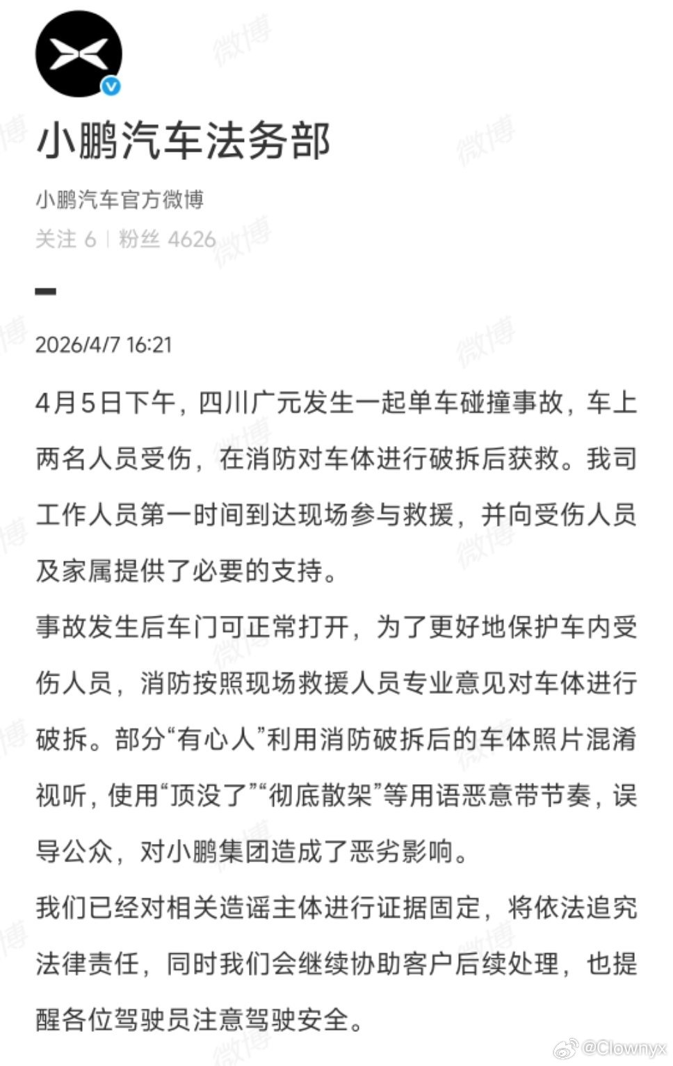 小鹏汽车辟谣事故后车辆散架各平台群里都发酵几天了传播的太广了才想起来有个法务部是