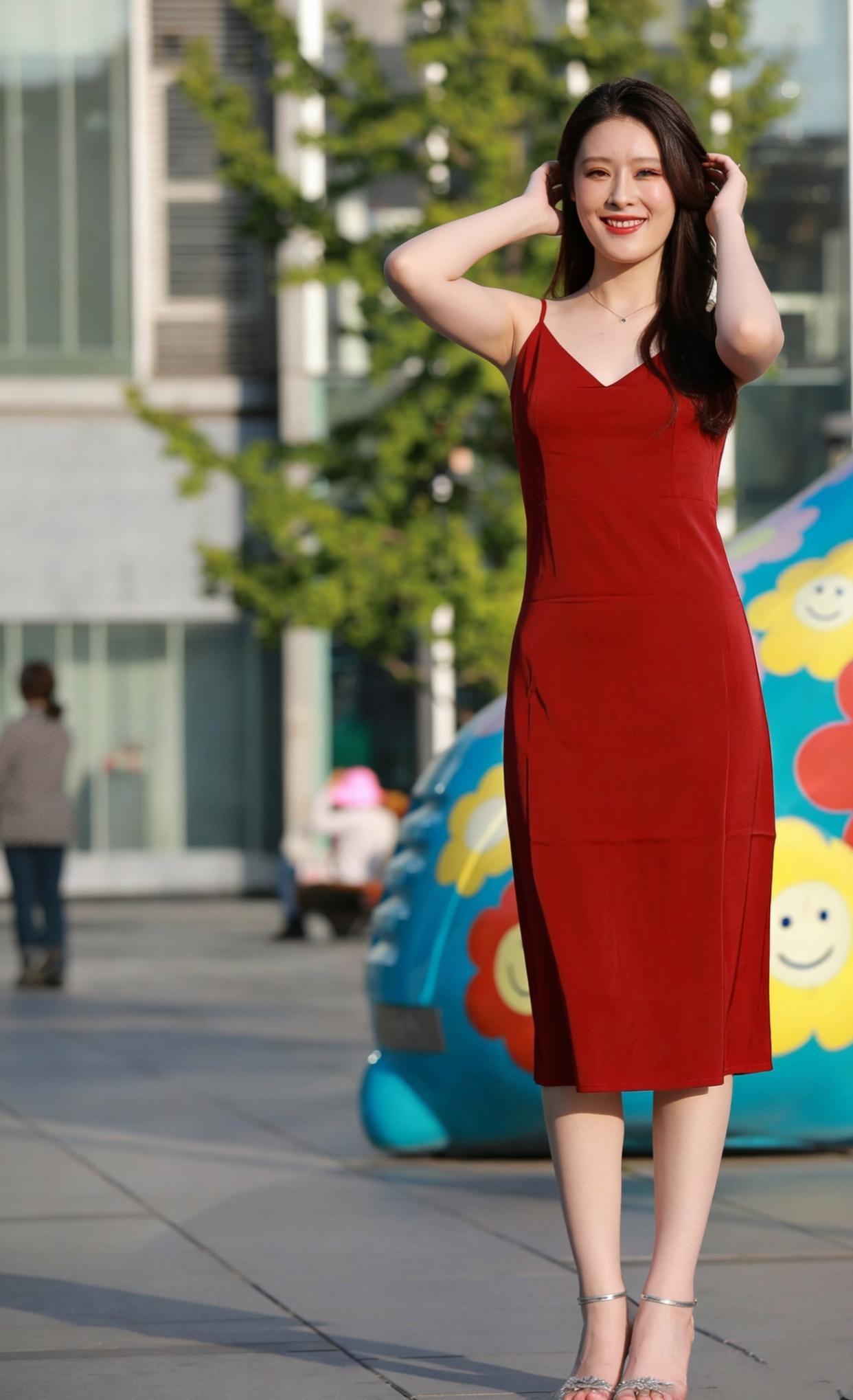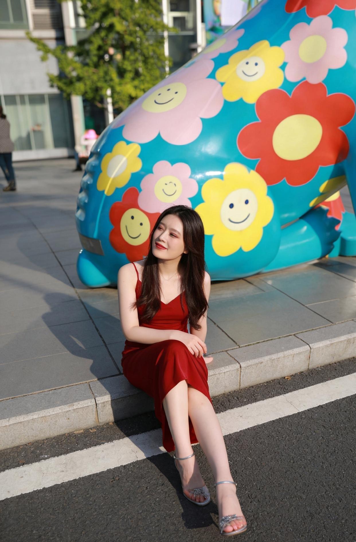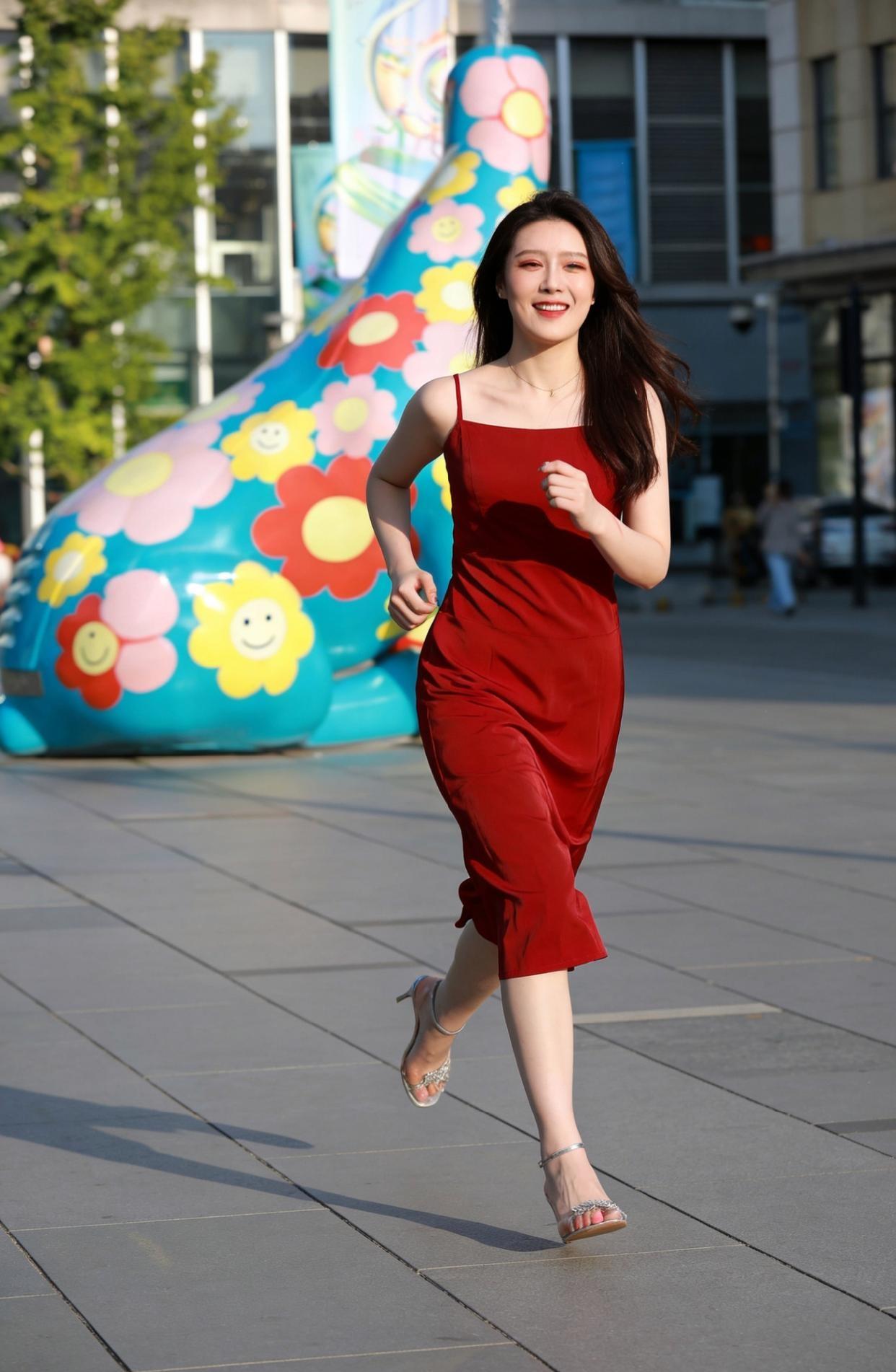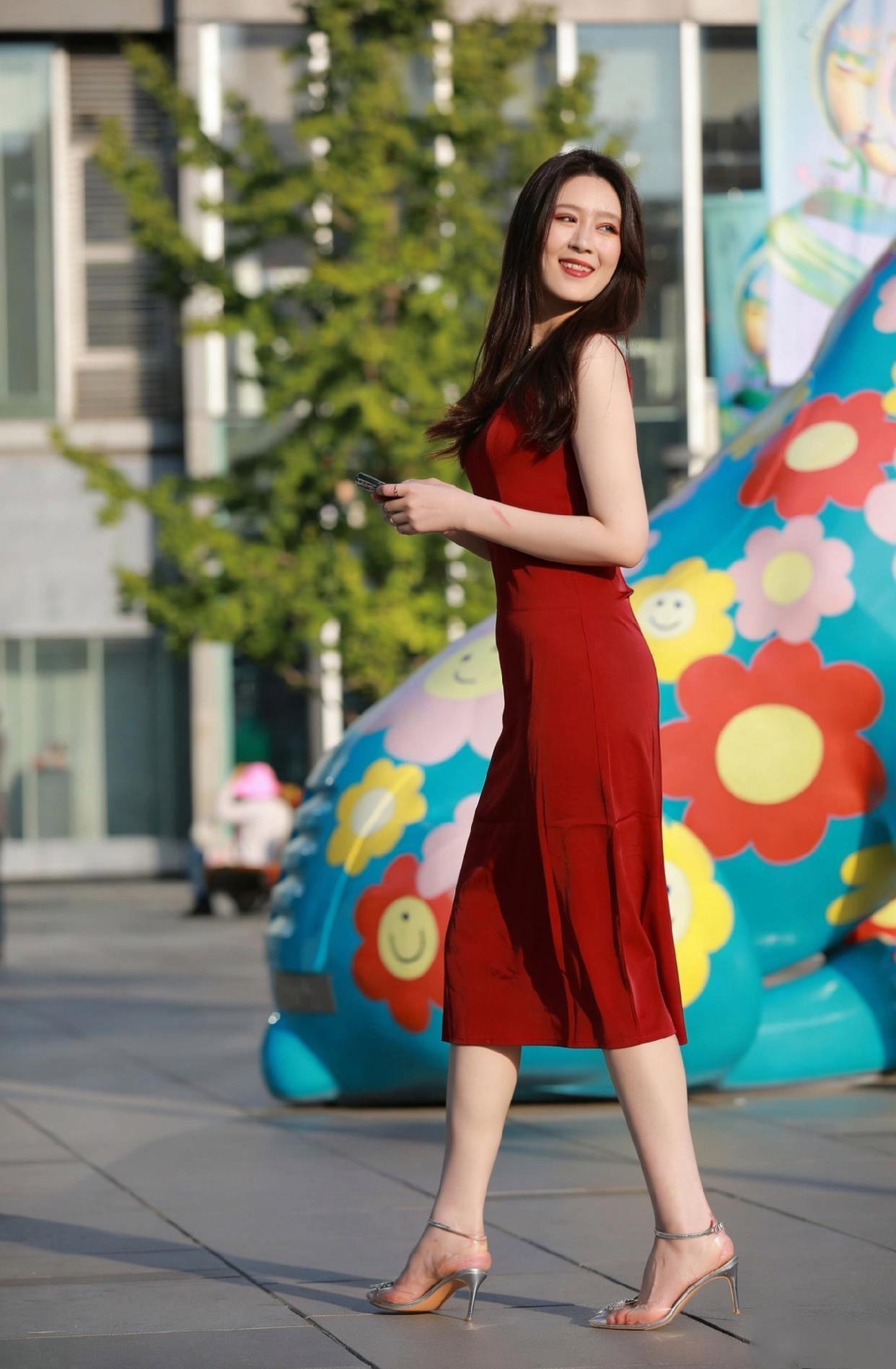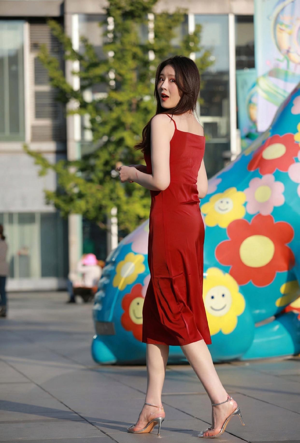 酒红吊带裙搭配高跟鞋,清新中带着性感的韵味!