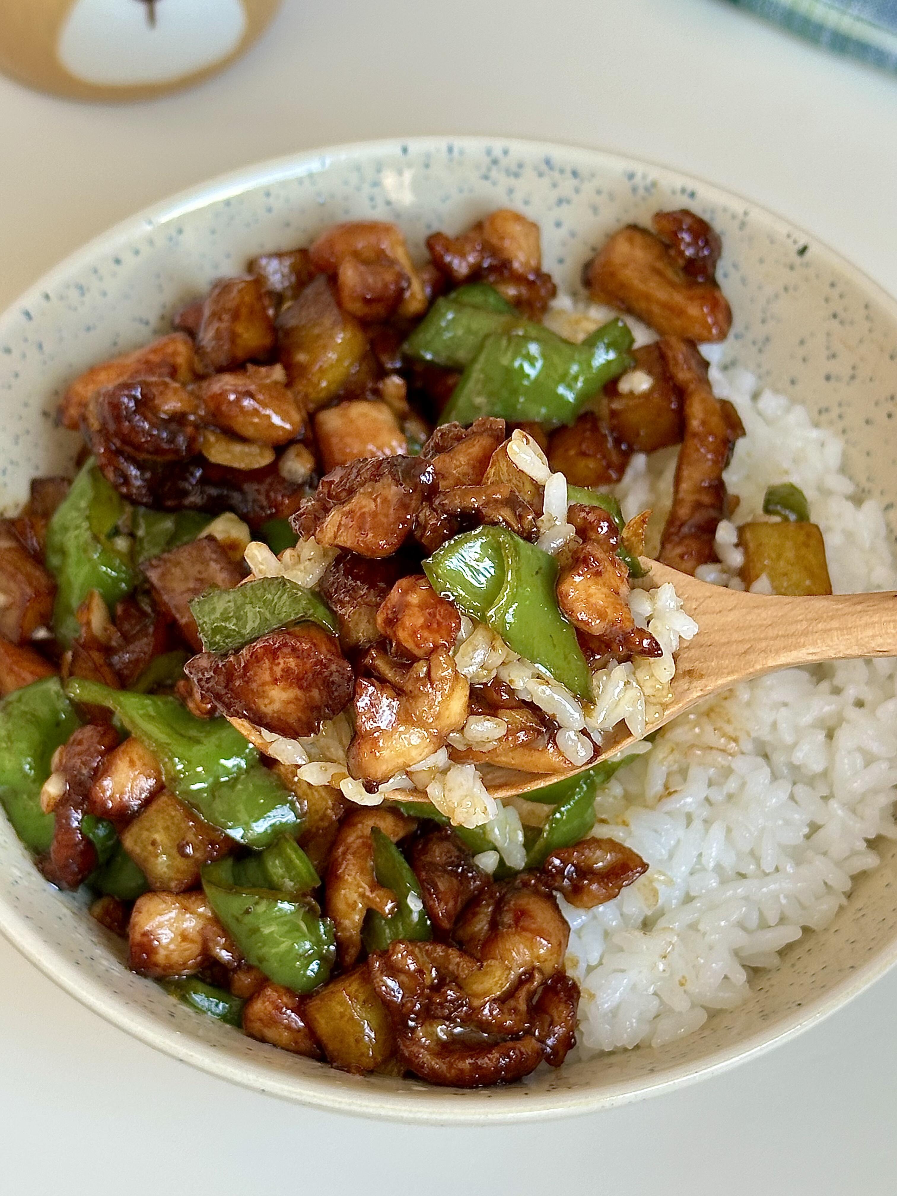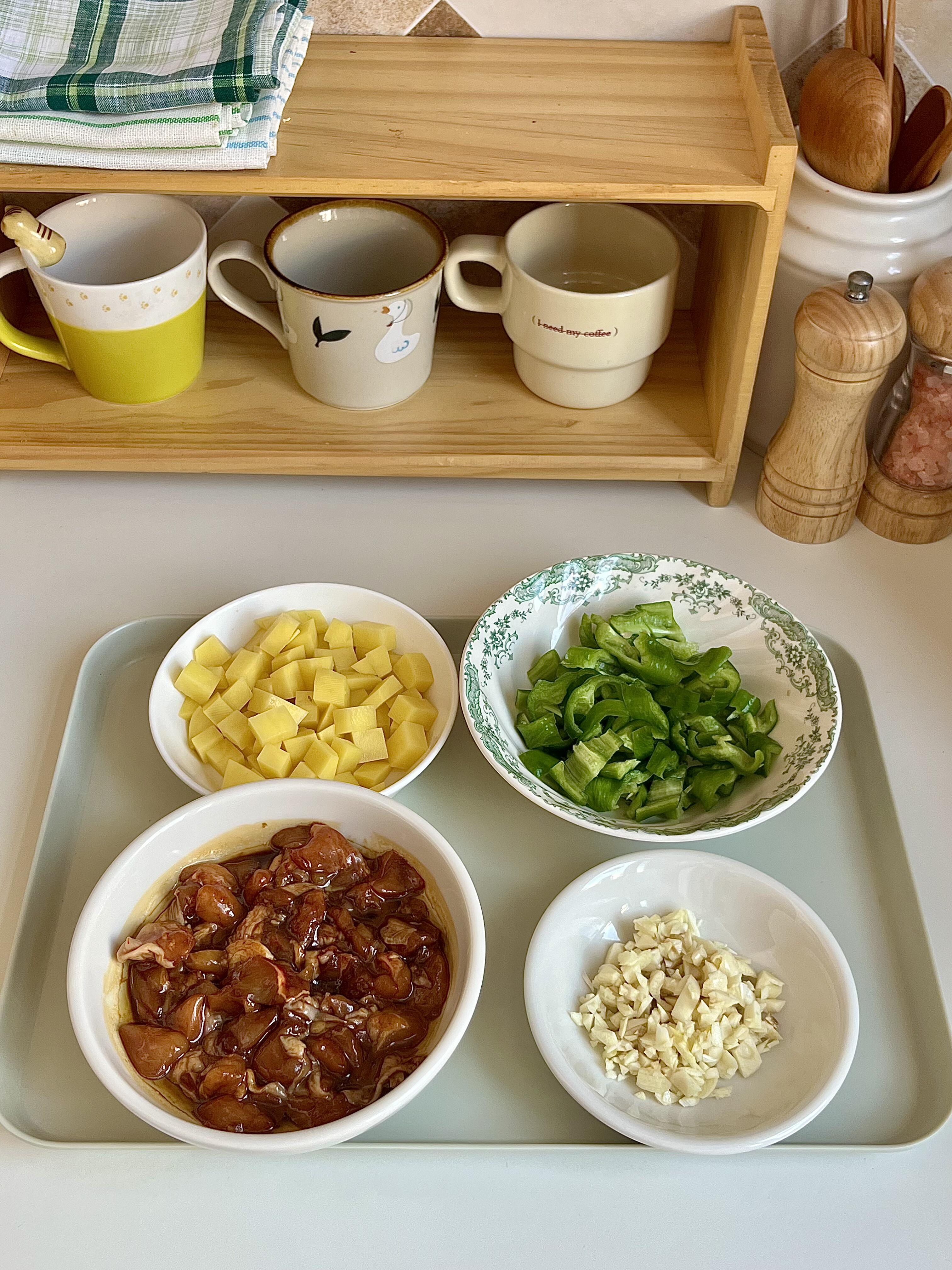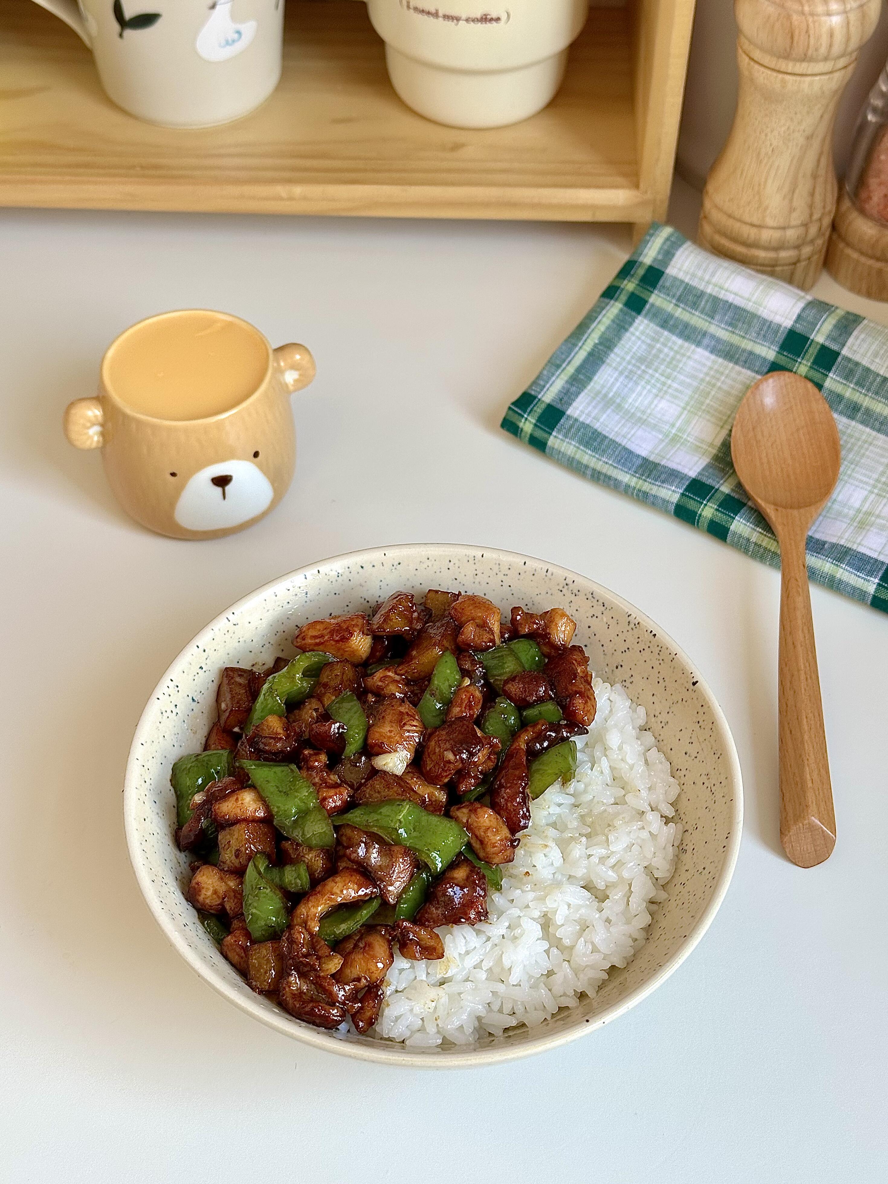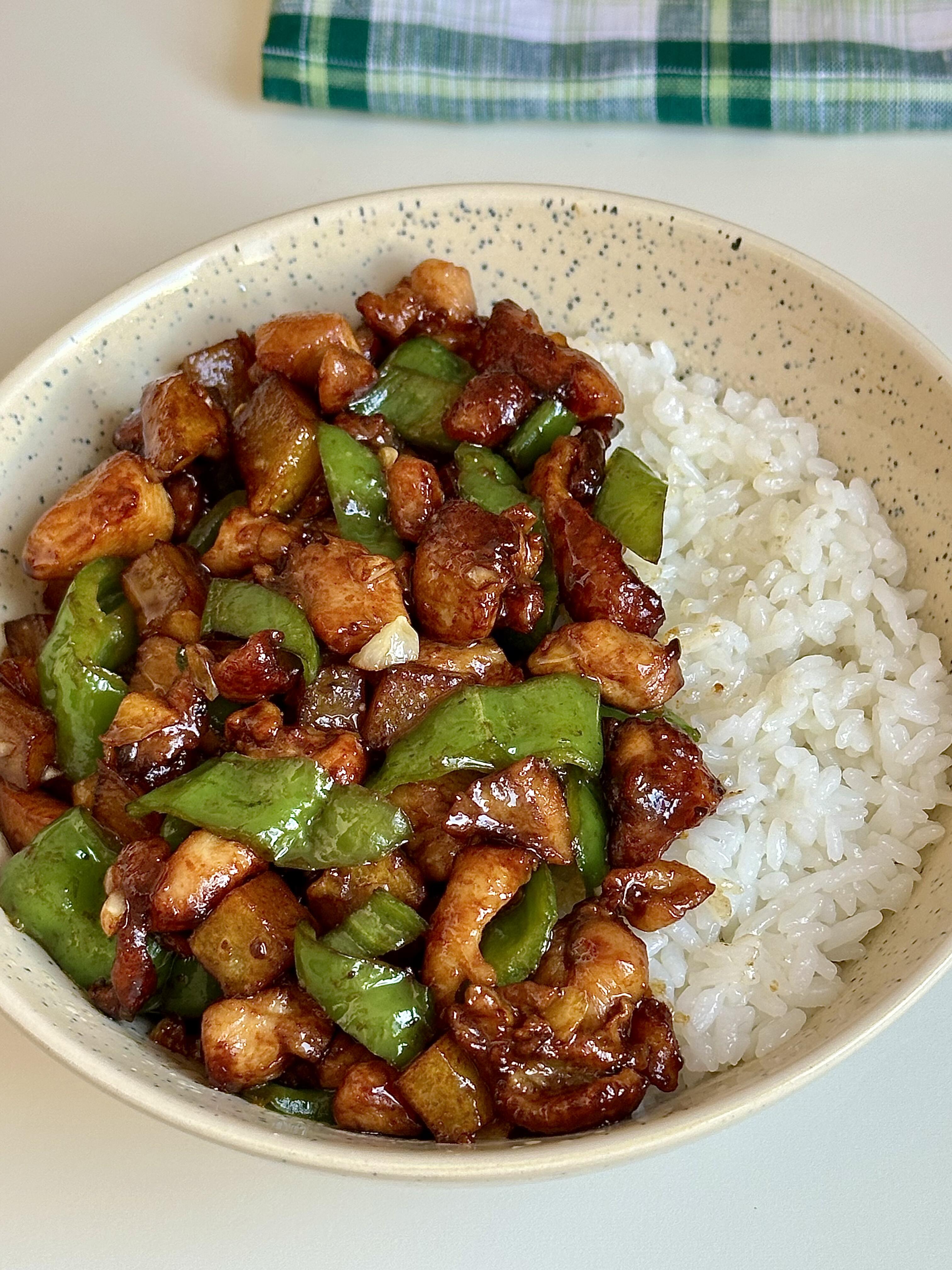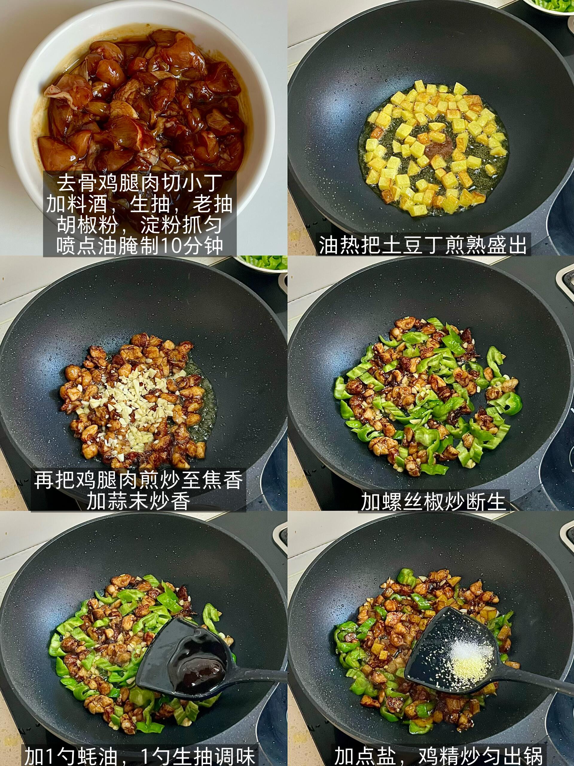 青椒小炒鸡,鸡肉外焦里嫩,香辣下饭 用鸡腿肉做的小炒肉,外焦里嫩,完全不柴!配着脆爽的青椒和粉糯的土豆丁,拌米饭我能多吃两碗😋 - 制作步骤 - 鸡腿肉切小丁,加料酒、生抽、老抽、胡椒粉、淀粉抓匀,喷点油腌制10分钟 - 油热下土豆丁,煎到金黄熟透盛出备用 - 用锅里的底油,下腌好的鸡腿肉,煎炒到焦香,加蒜末炒出香味 - 放入螺丝椒,大火翻炒到断生 - 倒回煎好的土豆丁,加1勺蚝油+1勺生抽调味 - 加少许盐、鸡精,翻炒均匀就可以出锅啦!
