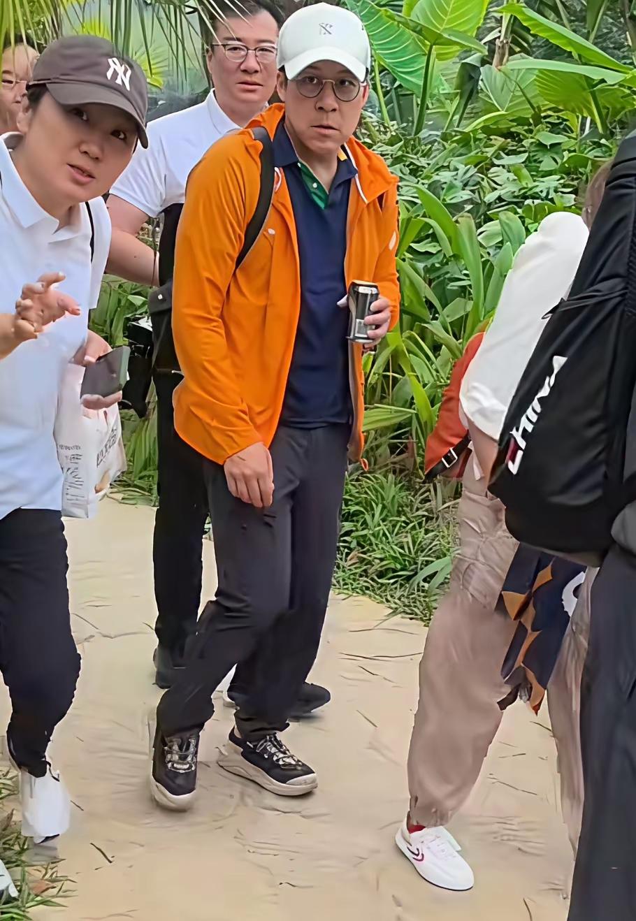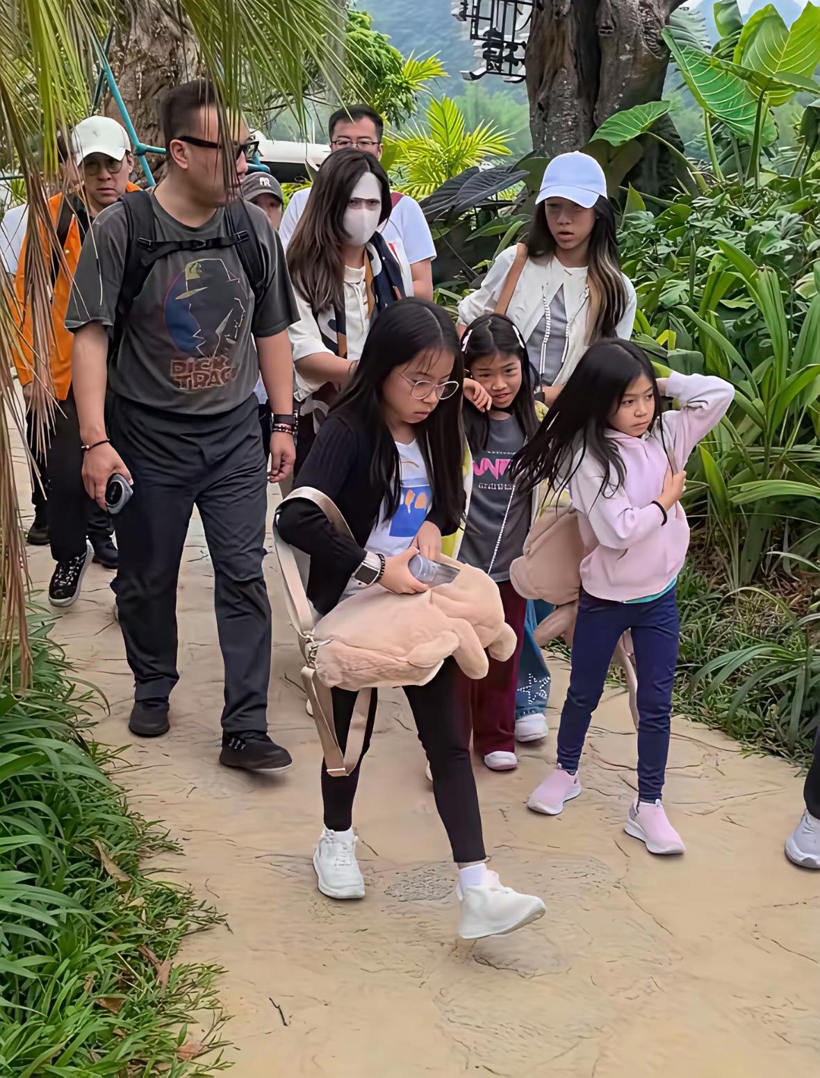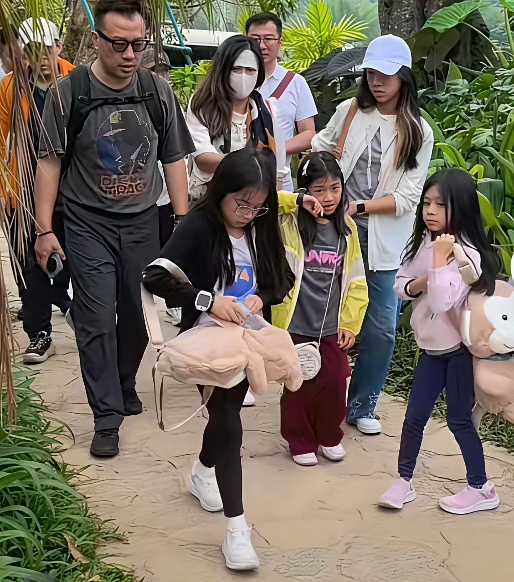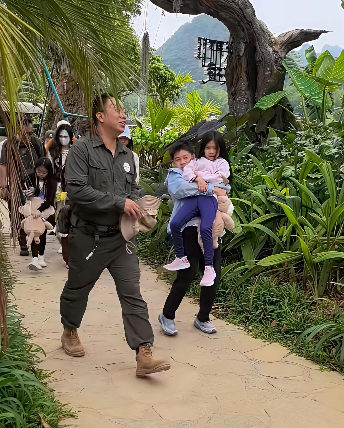 霍启刚带仨娃在广西崇左逛景区的照片,被游客拍了个正着——没保镖没助理,三个孩子背