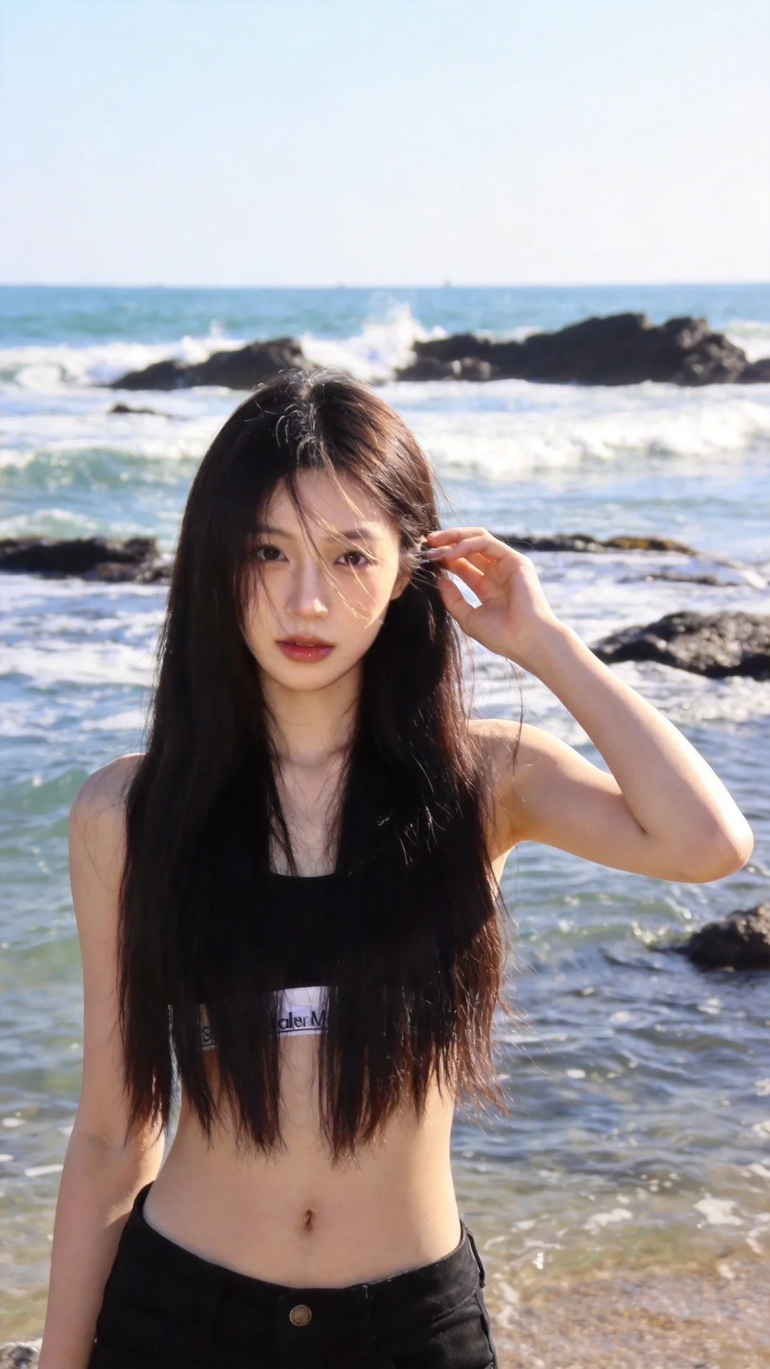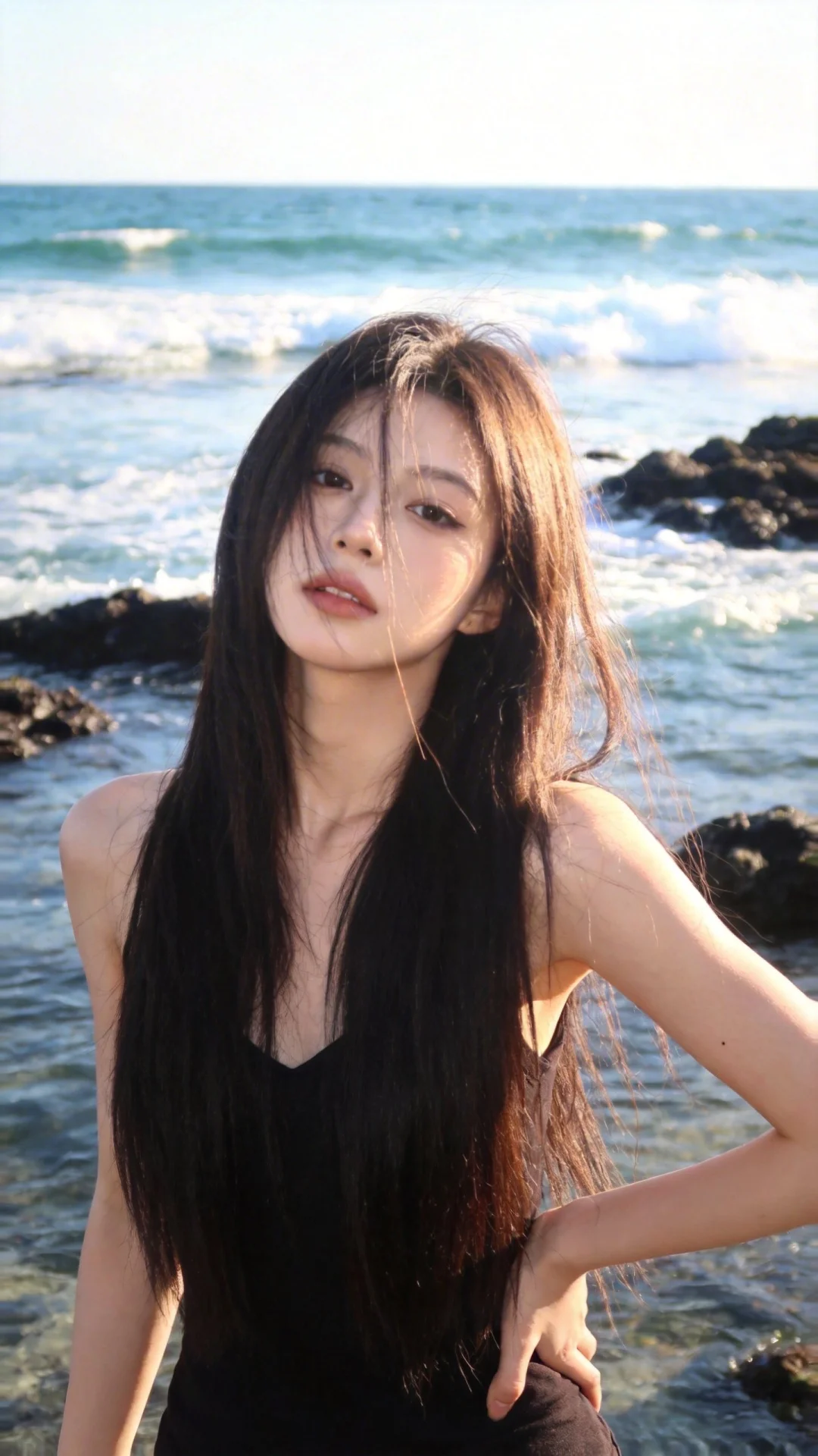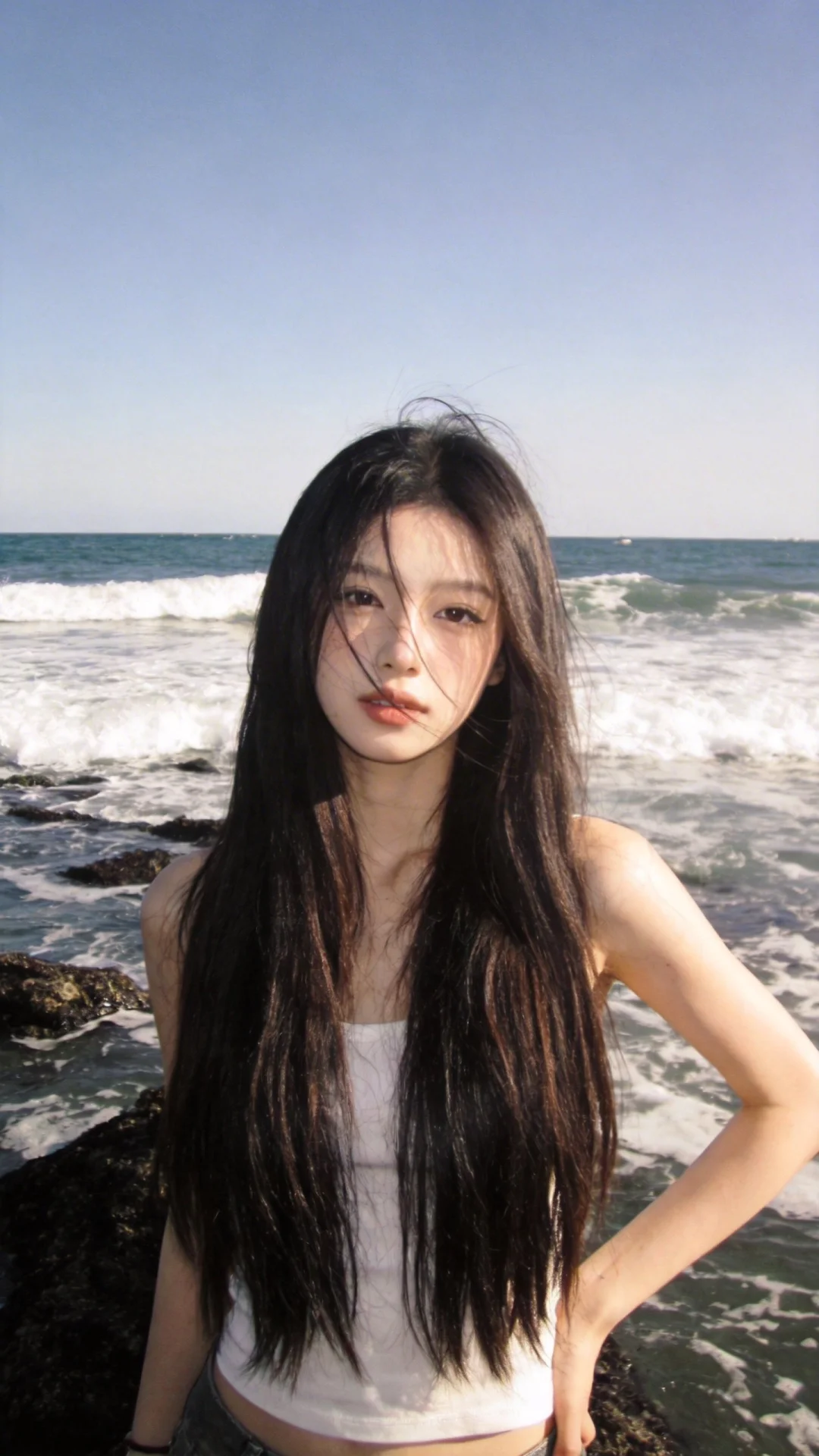 写实摄影风格(非商业修图),CCD拍摄质感,大师作品级氛围,保留轻微噪点,高光不过曝,阴影有细节;阳光透过发丝照在脸上以突出自然肌肤状态,随意抓拍构图(无刻意构图感),呈现生活中绚丽日常的贴近写实感;画面因快门速度不足产生轻微运动模糊,存在轻微阳光不均导致的过曝;主体为20岁高颜值气质女生,长发及腰、模样似洋娃娃般可爱,高鼻梁、瘦身材瘦脸型;女生表情自然松弛慵懒,眼神自然不失真(可看镜头或不看镜头),整体神态灵动又不失随性,尽显慵懒悠闲状态;整体为唯美的氛围感情绪片,无清晰主体,似非常普通的iPhone拍摄视角,远景正面人像凸显海浪,摆着pose,海边,海浪,暗礁。