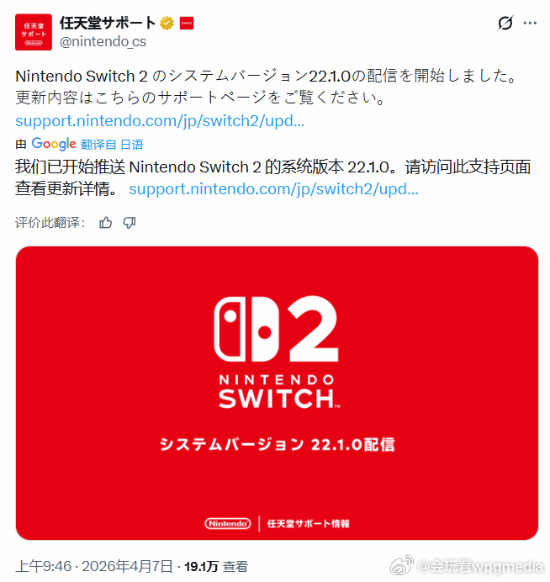 NS2迎来系统更新任天堂官方宣布为Switch 2推送系统版本22.1.0更新,