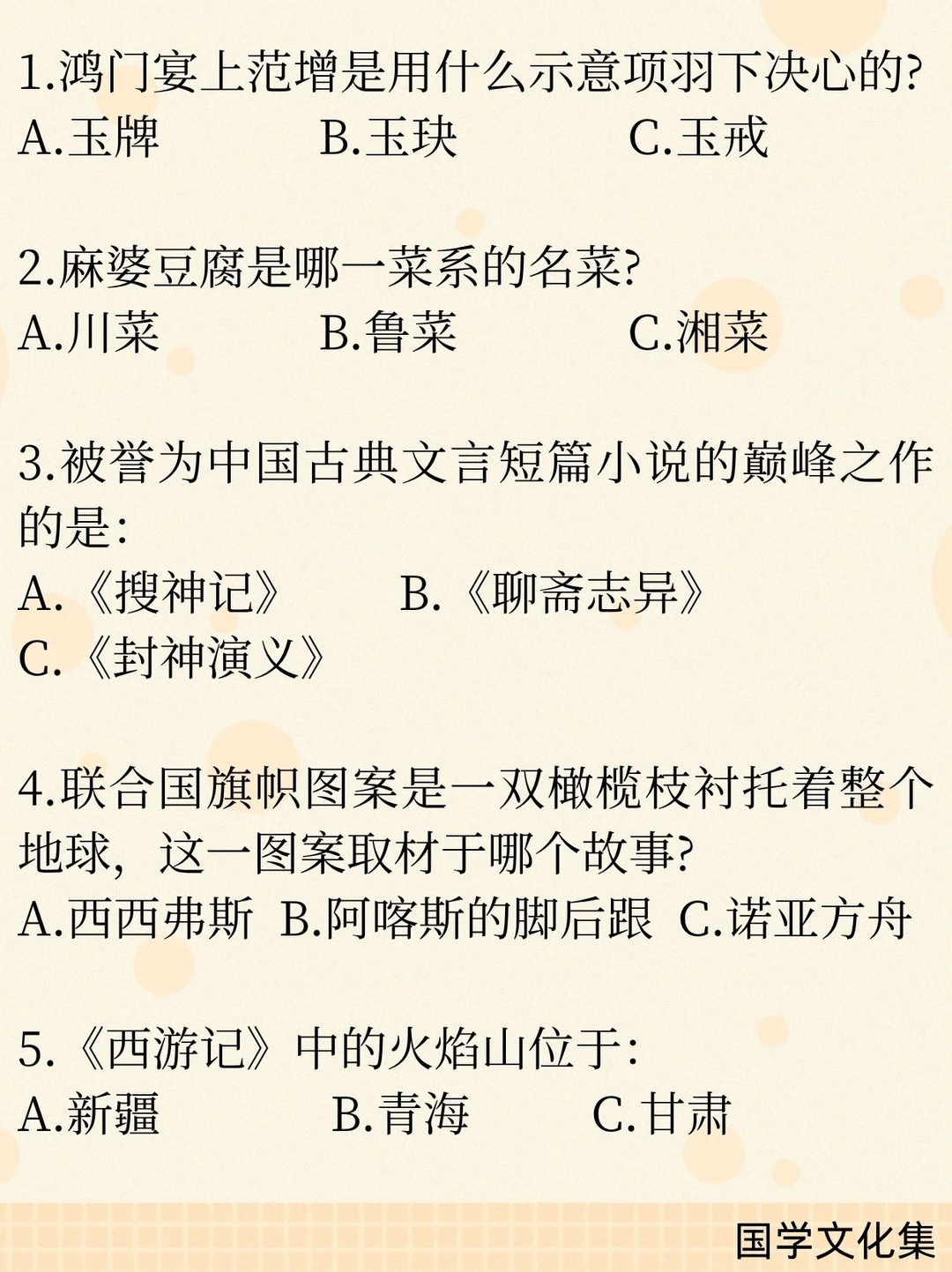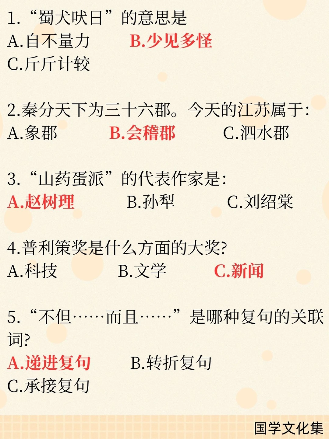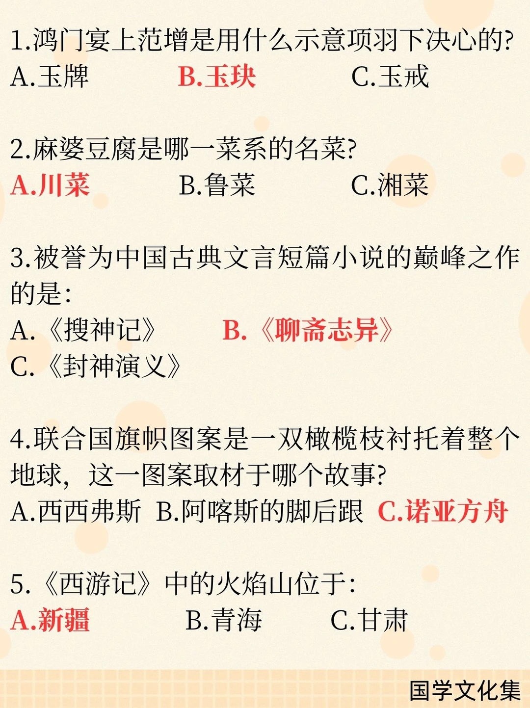一、文学作品与人物 1. 冉·阿让——《悲惨世界》主人公 2. 《西行漫记》又名《红星照耀中国》 3. 文言短篇小说巅峰——《聊斋志异》 4. “山药蛋派”代表作家——赵树理 二、历史与制度 1. “皇帝”称号始于秦始皇 2. 鸿门宴范增举“玉玦”示意项羽 3. 秦朝江苏属会稽郡 4. 故宫为明、清两朝皇宫(共2个朝代) 5. “珍珠翡翠白玉汤”与朱元璋有关 三、成语与俗语 1. 蜀犬吠日——少见多怪 2. 博士买驴——讽刺行文啰嗦、废话连篇 3. 兰桂齐芳——“兰桂”指子孙 四、文化与艺术 1. 麻婆豆腐属于川菜 2. 京剧手势:双食指合并表示夫妻/相配 3. 递进复句关联词:不但……而且…… 五、中外常识 1. 海东青是满族图腾,为一种猛禽(动物) 2. 西游记火焰山位于新疆 3. 联合国橄榄枝图案出自诺亚方舟 4. 普利策奖为新闻界大奖 5. 《史记》论及当时统治者(汉武帝)