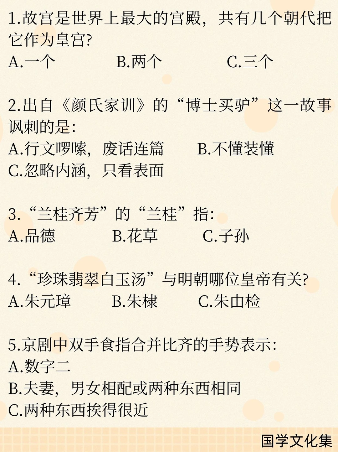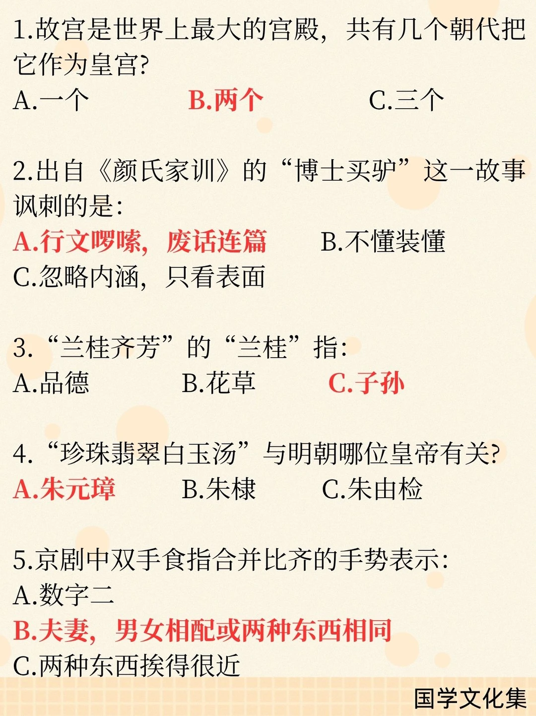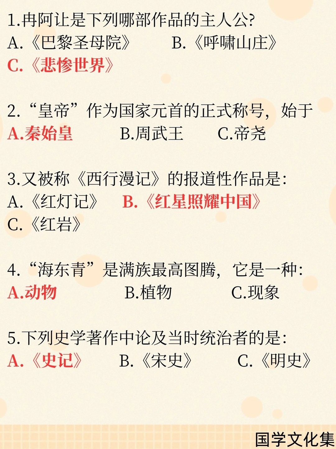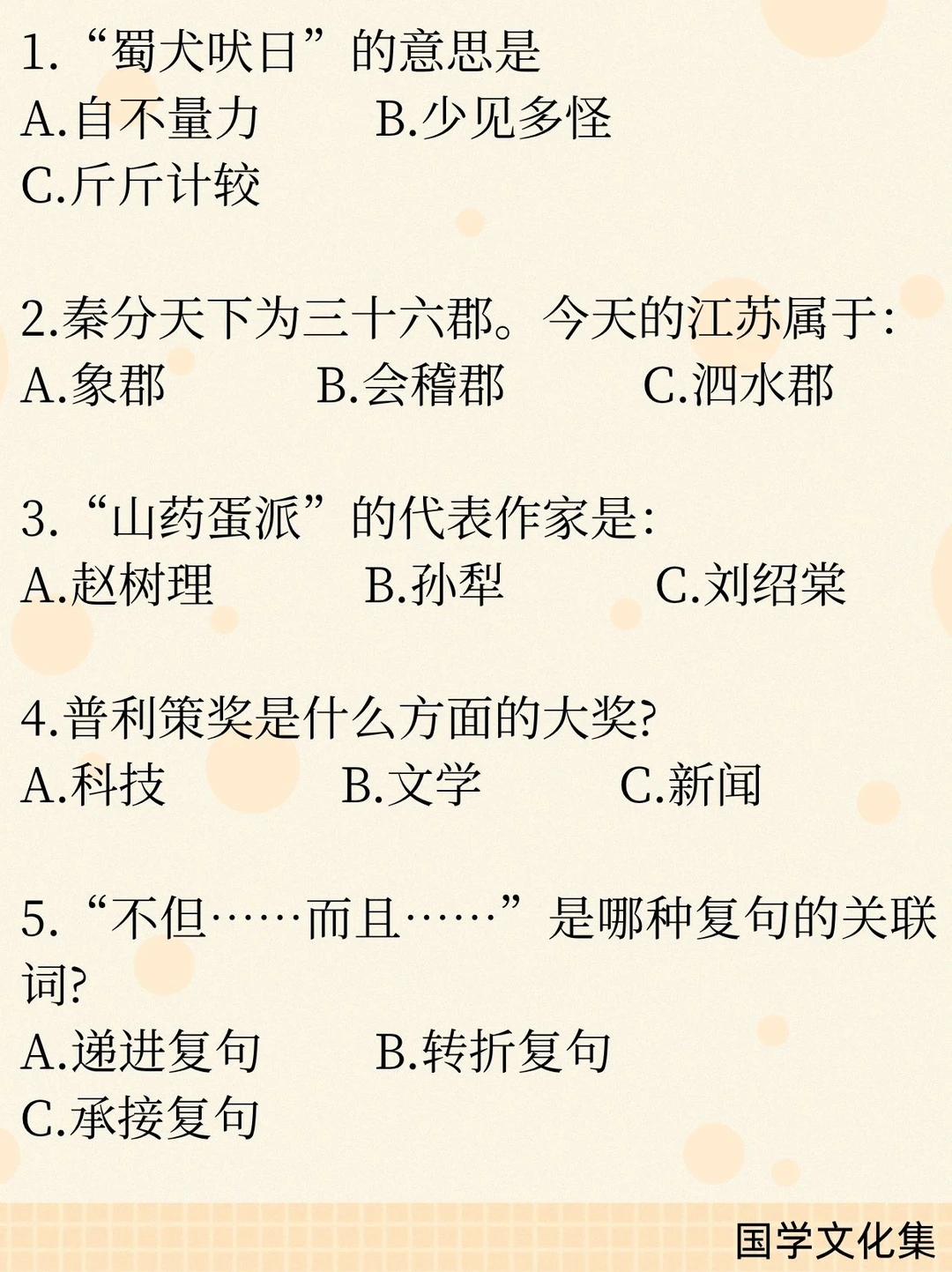 一、文学作品与人物 1. 冉·阿让——《悲惨世界》主人公 2. 《西行漫记》又名《红星照耀中国》 3. 文言短篇小说巅峰——《聊斋志异》 4. “山药蛋派”代表作家——赵树理 二、历史与制度 1. “皇帝”称号始于秦始皇 2. 鸿门宴范增举“玉玦”示意项羽 3. 秦朝江苏属会稽郡 4. 故宫为明、清两朝皇宫(共2个朝代) 5. “珍珠翡翠白玉汤”与朱元璋有关 三、成语与俗语 1. 蜀犬吠日——少见多怪 2. 博士买驴——讽刺行文啰嗦、废话连篇 3. 兰桂齐芳——“兰桂”指子孙 四、文化与艺术 1. 麻婆豆腐属于川菜 2. 京剧手势:双食指合并表示夫妻/相配 3. 递进复句关联词:不但……而且…… 五、中外常识 1. 海东青是满族图腾,为一种猛禽(动物) 2. 西游记火焰山位于新疆 3. 联合国橄榄枝图案出自诺亚方舟 4. 普利策奖为新闻界大奖 5. 《史记》论及当时统治者(汉武帝)