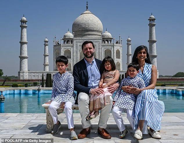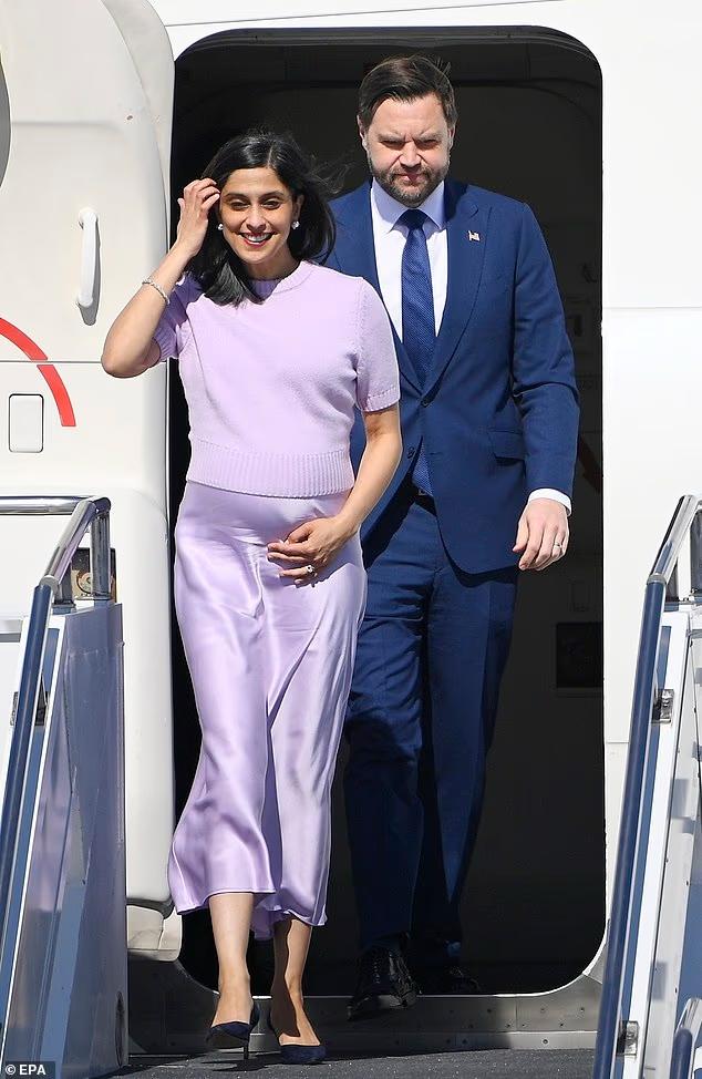 美国第二夫人乌莎·万斯温柔地抚摸着她日益隆起的孕肚,与丈夫、副总统约翰·迪·万斯