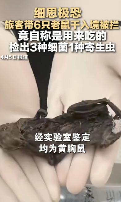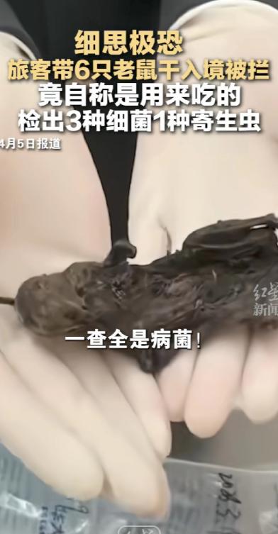 “细思极恐”!真的越想越让人后怕,2026年3月19号,合肥新桥机场海关,工作人员在一名走绿色通道入境旅客的托运行李里,查出了6只黑乎乎干瘪的老鼠干,总共重量才0.205千克,海关工作人员当场询问,这名旅客还一脸淡定地说,带这些东西就是自己吃的。 说白了,这哪里是什么个人食用的“特色食材”,分明是拿国门安全当儿戏,背后说不定还藏着更阴损的猫腻,想想都让人后脊梁发凉! 事情发生在2026年3月19号,合肥新桥机场海关的工作人员跟往常一样,坚守在入境查验的岗位上,不敢有丝毫松懈。 有一名旅客走的是绿色通道,本以为是携带的物品符合规定、无需申报,结果托运行李过机时,机检图像出现了异常,工作人员立刻警觉起来,当即决定开箱查验。 一打开行李箱,里面的东西就让人头皮发麻——6只黑乎乎、皱巴巴的老鼠干,被随意装在塑料袋里,看着就恶心,据说总重量才0.205千克,不算多,但足够让人警惕。 面对海关工作人员的询问,这名旅客居然一脸淡定,没有丝毫慌乱,轻描淡写地说这些老鼠干就是自己吃的。 我真的没法理解,什么样的人会把老鼠干当成食物,还特意从境外带回来?而且全程淡定得反常,这绝对没有那么简单!我总觉得,这种人说不定跟哪个坏种阴损国家有勾连,故意带这种未经检疫的东西入境,说不定是想搞什么破坏,这种行为必须严惩,绝对不能轻饶! 首先得好好感谢守护海关的工作人员,要是没有他们的细心和负责,这6只老鼠干说不定就顺利入境了。 要知道,老鼠本身就是多种病菌、寄生虫的宿主,我听说这次查获的老鼠干,经实验室鉴定都是黄胸鼠,还检出了多种病菌和寄生虫,要是流入境内,不管是被人食用,还是不小心扩散,都会带来极大的公共卫生风险。 海关工作人员的每一次细致查验,都是在为我们筑牢国门安全的防线,真的太让人安心了。 说到这里,我就忍不住想吐槽一句,也想批评下海关哈,我们平时坐地铁,带一瓶水都要亲口喝一下验证,证明是可以饮用的,避免有安全隐患。 这次这名旅客明明说老鼠干是自己吃的,海关为什么不当场给他一次亲身验证的机会?让他当场吃一口,看看他是不是真的敢吃,是不是在撒谎,毕竟口说无凭,他说自己吃,那就用行动证明,这样也能戳破他的谎言,不至于让他这么淡定地蒙混过关。 而且这类人员一定要登记在册,录入黑名单,重点监管,我认为,能做出这种事的人,绝对不是第一次心存侥幸,说不定以前也带过类似的违禁品,只是没被查到。 把他们列入黑名单,以后他们出入境的时候,重点查验他们的行李物品,说不定还能有新的发现,决不能放过这种拿国家安全当儿戏的人,毕竟这种未经检疫的动物制品,一旦流入境内,危害的是我们所有人的安全,容不得半点马虎。 我还听说,最近不止合肥海关,其他地方的海关也查获过类似的违禁物品,有带老鼠干的,还有带酱汤泡蚂蚁卵、未经检疫猪肉制品的,都是说自己吃的,可见这种情况并不是个例。 这也提醒我们,国门安全无小事,哪怕是看似不起眼的一小袋老鼠干,背后都可能隐藏着巨大的风险。 最后说明一下,以上内容只是我个人看法,不代表任何官方观点,毕竟我也只是个普通网友,单纯觉得这件事越想越后怕。大家对这件事有什么看法?觉得这名旅客是真的自己吃,还是另有目的?海关没有让他当场验证,做得对不对?欢迎在评论区留言讨论。