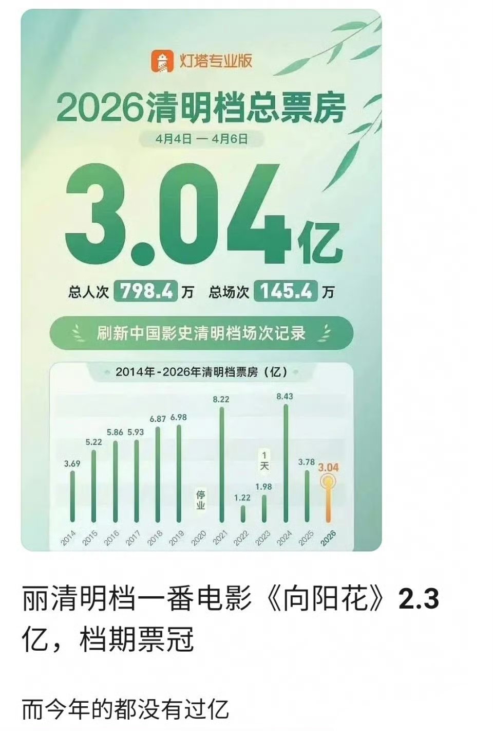 今年清明档还没有一部电影过亿,赵丽颖《向阳花》2.3亿票房是去年清明档票房冠军,