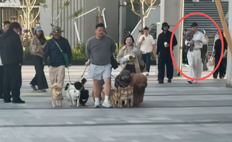 一个人正牵着6、7只狗狗逛街,黄景瑜看到后,从后面大步流星地追上来,只为了撸几下