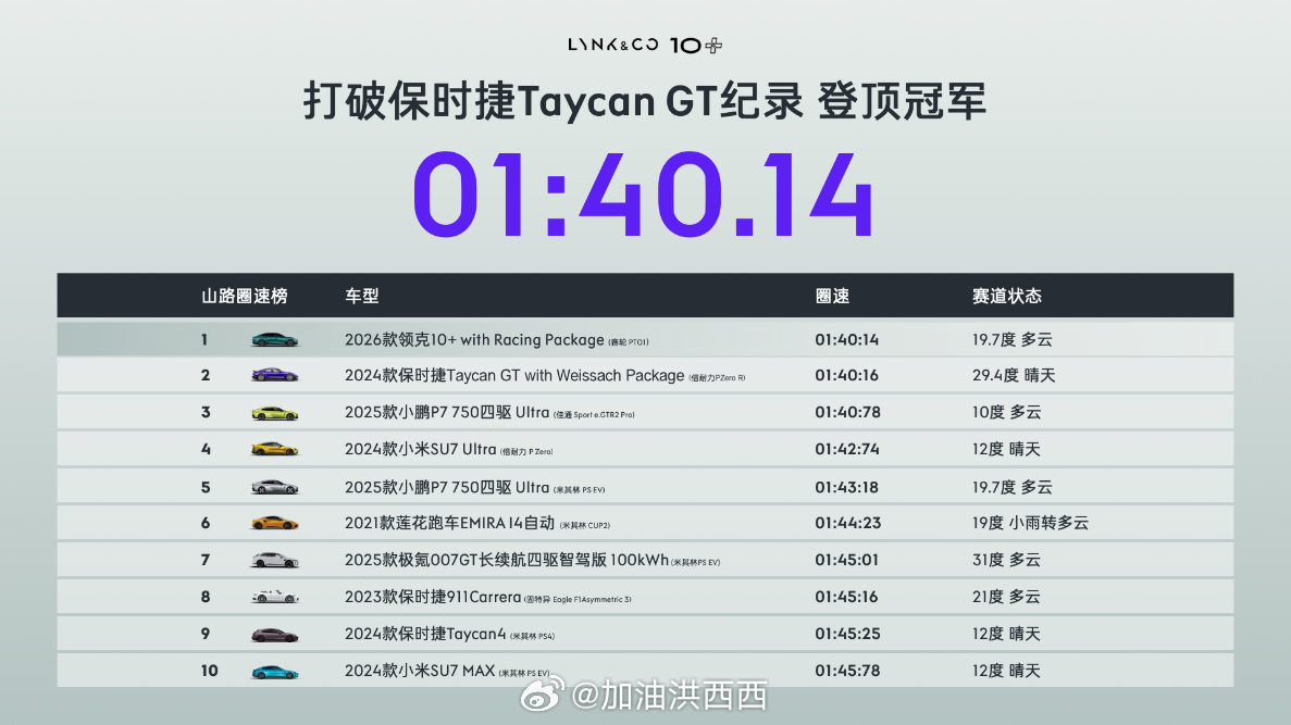 领克极冲进入1秒2公里时代了!刚刚,领克 10 + 和 领克10 秀了一波三电系统和赛道性能。900V 神盾金砖电池直接实现 1 秒极充 2 公里,10%-70% 充电才 4 分 22 秒,充到 97% 也才 8 分 42 秒,续航最高还能到 816km,这次提升直接进入了一个新时代。领克 10 + 带性能套件跑亚洲山脊赛道,1 分 40 秒 14 力压保时捷 Taycan GT和一众新能源性能车,赛道里又要有新的狠角色了!性能参数也不差,680kW 双电机,零百 3.2 秒,中段加速也才 2.1 秒,键盘值不低。设计上还有赛影蓝新车色和暗影红内饰,颜值质感都在线,10 + 的碳纤维尾翼也彰显了性能的身份。价格段也挺实在,领克 10 主打 20-23 万,10 + 走 25 万级高性能路线,中大型纯电运动轿车这下又多了个靠谱选择! 领克 10 全球首秀领克三电技术发布