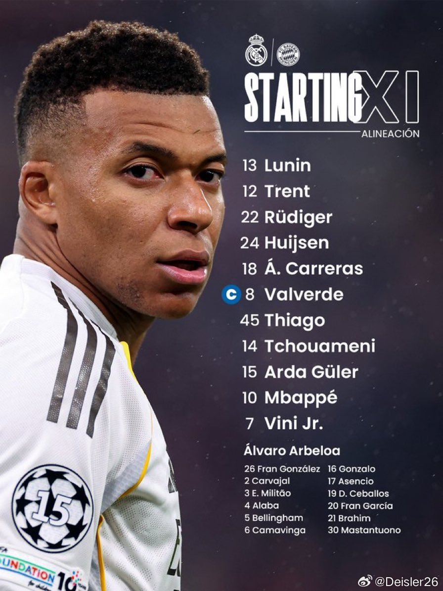 Lunin; Trent, Rüdiger, Huijsen, Carreras; Valverde, Thiago Pitarch, Tchouaméni;Arda Güler; Mbappé, Vini Jr.🇪🇸