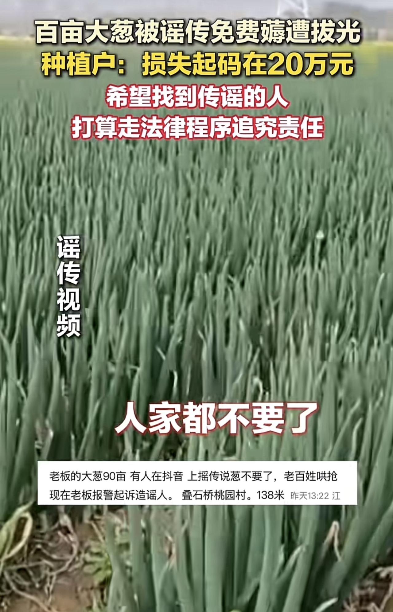 我是感觉这些薅大葱的人当中肯定有一些是存在侥幸心理的。正常人一看就知道这么好的大葱不可能没人要,而且还是100多亩。但是看到那么多人都去了,那也就跟着去了。反正到时候追究起来,我就说我不知情,是别人说大葱不要了。