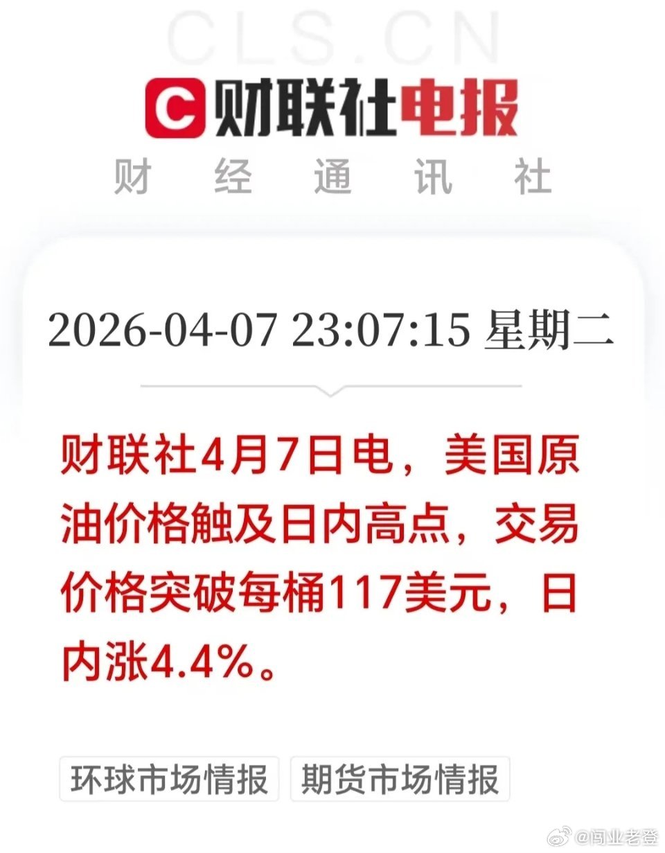 深夜突发:国际油价大幅拉升,WTI原油强势突破117美元,单日大涨4.4%油价突然大幅走高,核心原因有两点:一是欧佩克3月份原油产量出现40年来最严重断崖式下滑,日产量锐减756万桶,供应端严重收缩;二是地缘局势持续紧张,多重利好共振下,国际原油价格继续上行的势头明显。对A股而言,这不是简单的涨价逻辑,而是典型的上游受益、下游承压的结构性分化行情。明天开盘,资金大概率会优先聚焦拥有油田资产的上游油气龙头。但A股油气板块历来有“高开低走”的特征,如果明天开盘冲高过猛,短线获利盘很容易集中砸盘,需警惕冲高回落。稳妥策略:重点观察龙头(如中国海油)走势,若高开后快速回落,要防范一日游行情,切勿盲目追高。本文仅为市场热点分析,不构成投资建议。