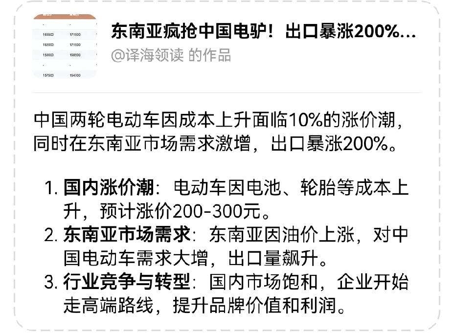 要保证我们的商品卖出好价钱,不要把黄金卖成铁蛋蛋。国家要严查倾销行为,防止“外卷”。会不会又像中国摩托败走越南的结局?国内电驴厂家一窝蜂涌入国外市场,最后自相残杀,大打价格战,导致产品利润被压得越来越低,最后只能走偷工减料的老路,最后被国外市场抛弃,又全部羽杀而归。宗申摩托出海就是前车之鉴,现在在国外消失的无影无踪,倒是日系摩托车在国外特别是东南亚横行几十年。但愿国家和企业共同努力,维护好海外市场,不卷不内斗。