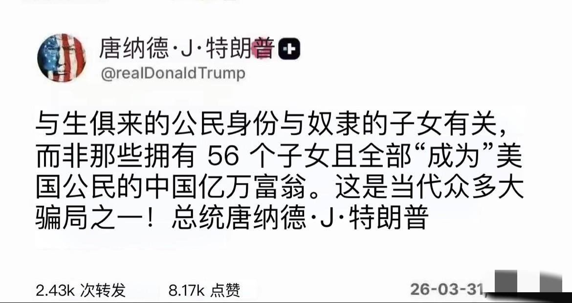 特朗普连夜破防!中国富豪靠疯狂下崽直接把美国国籍给“卷”崩了! 某神秘大佬远赴美国开枝散叶,一口气砸出56个美籍娃。这生育效率堪比超频运转的人形印钞机。 特朗普气急败坏把“成为”俩字加上引号。潜台词震耳欲聋:美国户口本想拿就拿?休想! 这波操作活像薅秃了美国福利的超级羊毛,硬生生把美国当成了免费自助孕产房。吃相极其狂野。 特朗普这回被逼到了墙角,挥起大刀砍向出生公民权。56个娃砸出的核弹级冲击波,注定要把美国的移民大门炸得粉碎!
