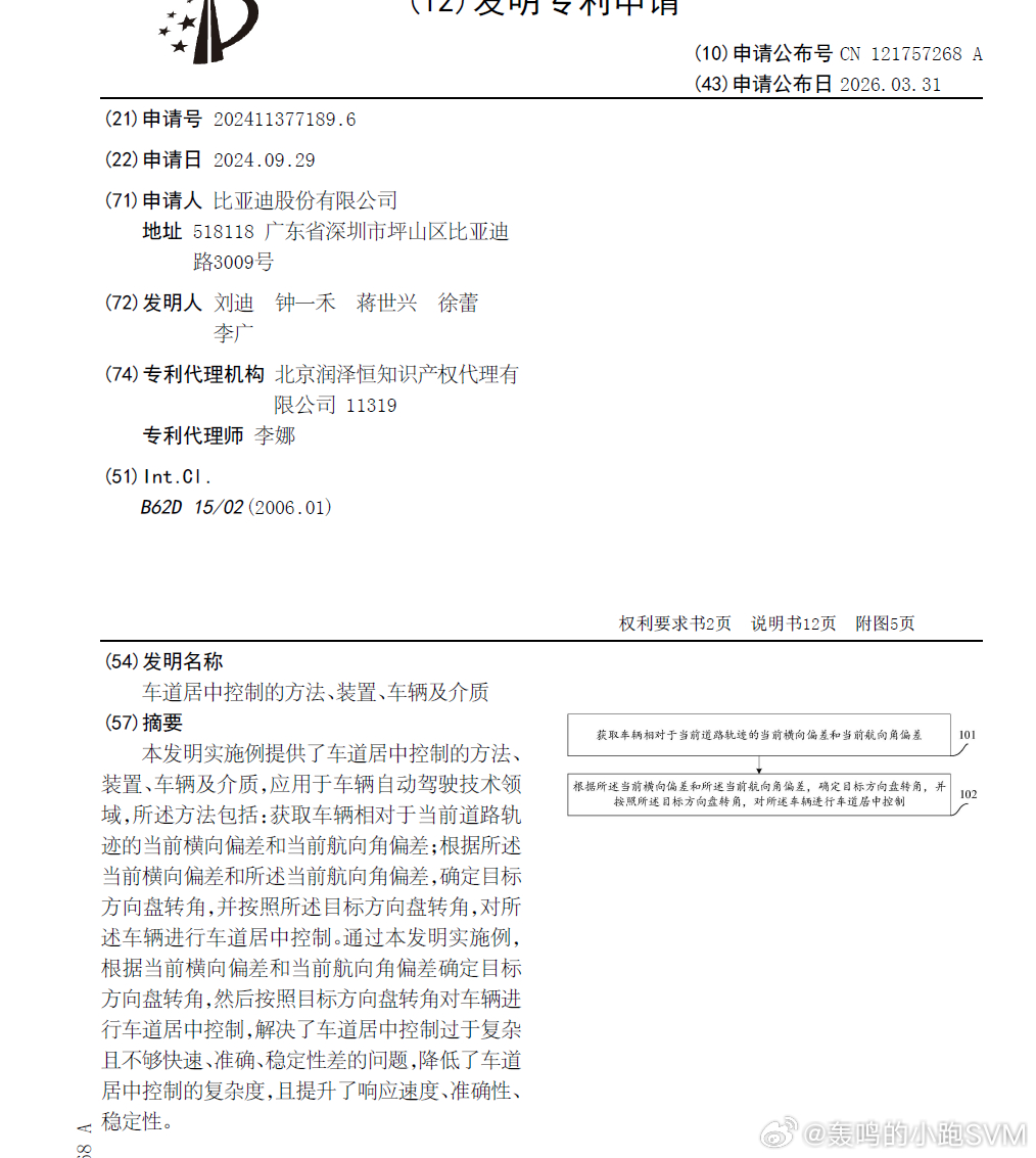 技术巡猎 比亚迪 车道居中控制的方法、装置、车辆及介质。LCC,大家的注意力