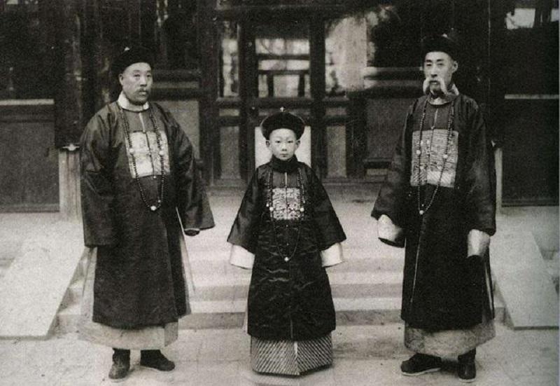 1922年12月,北京,中间的幼童正是末代皇后郭布罗·婉容的亲弟弟、中国最后一位“国舅爷”——郭布罗·润麒。 润麒是末代皇后婉容的胞弟,末代皇帝溥仪的三妹爱新觉罗·韫颖的丈夫,10岁的润麒作为皇后亲弟,凭借清代恩荫制度+国舅身份,被授予世职,因此获准穿着全套清代官服、佩戴朝珠,拍摄这张正式肖像照,这是润麒存世最早的清晰影像之一。