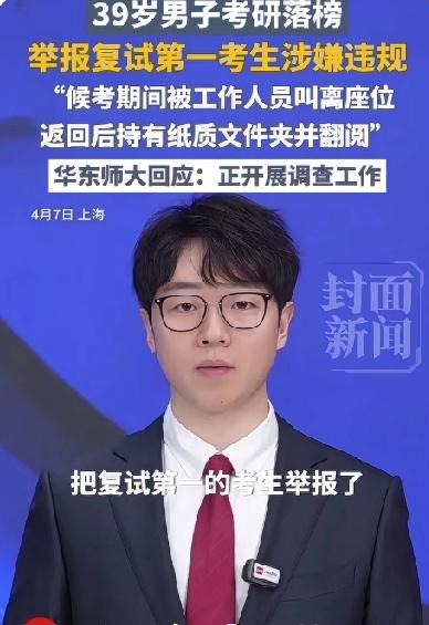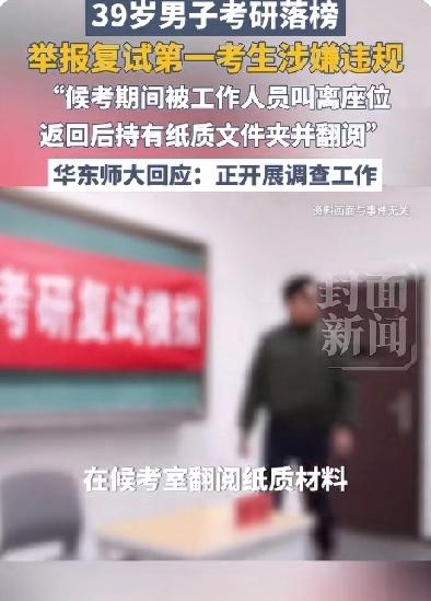 39岁男子考研落榜后举报复试第一的考生,称其在候考室违规翻阅资料!校方回应 3月27日,华东师范大学设计学院2026年硕士研究生复试正在进行。 候考室内,39岁的江西考生王先生注意到一个细节:一名编号为4号的考生曾被工作人员叫离座位,返回后“手中持有文件夹并进行翻阅”。当时复试现场PPT上明确写着:“不得携带任何复试有关资料进入候考室,如有按违纪处理。”所有考生均已签署《诚信复试承诺书》。 周围的几名考生也看到了这一幕。王先生并非初次参加考研的新人。他今年39岁,曾是地产从业者,白天兼职,晚上刷题,最终以初试第8名的成绩闯入复试。复试中他发挥不错,排名第2,综合成绩位列第6。然而,设计学院今年只招5个人,他落榜了。他认为,如果4号考生真的违规,那么规则就应该公平适用。王先生称“我争的不是一个名额,而是规则能不能一视同仁,证据能不能无条件公开。” 复试当天,王先生就向设计学院反映了情况。3月30日,他通过邮件正式请求调取候考区9:30至10:30的监控录像。3月31日,设计学院回复:经调取监控、核实现场情况、查验相关材料,未发现与面试有关的资料,相关考生行为不构成考试违纪。 王先生不服。4月1日,他将申诉材料同时发往该校研究生招生办公室、纪委和设计学院。 4月3日,华东师大研究生招生办公室正式回复。校方称,已成立专项调查工作小组,反复逐帧查看监控录像,确认4号考生携带的材料为“准考证、学历证书备案表、在校证明、身份证复印件等资格审核材料”。校方解释,该生因“系统操作原因未能上传全部复试资格审核材料”,经考前征得设计学院同意,于复试当天携带纸质材料进行现场核验。由于材料与复试专业内容无关,且系工作人员允许带入候考室,故认定不违反相关管理规定。 但王先生不接受这个解释。他向记者提供了自己在报考系统中的上传记录截图,系统要求上传的材料仅三项:居民身份证、学籍学历材料、诚信复试承诺书。他全部上传成功,审核结果为“通过”。据此,他向校方提出三点质疑:4号考生究竟未能上传哪一项材料?若未上传全部材料,线上审核为何通过?校方所称“系统操作失败”,证据在哪里? 当他要求调阅监控录像时,校方回复称如果他申请调阅监控,就意味着他默认资格审核材料与复试相关资料无关。王先生拒绝了。4月7日,华东师大研究生招生办公室回应媒体称,学校有专门的调查小组处理此事,调查工作正在进行。 这件事被媒体报道后,迅速引发热议。有人说他输不起,落榜了就举报别人;也有人说他维护规则公平,值得支持。但不管怎么说,规则只要制定了就需要透明化,就要人们去遵守,而校方也只有在调查中给出一个让人信服的答案,公布事实真相才能让考研的公平性得到保障!