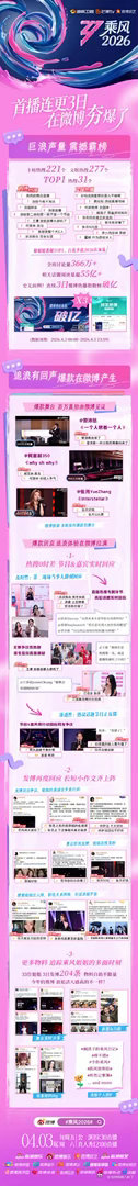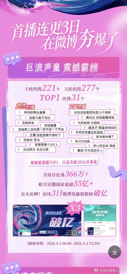乘风2026夯爆了 《乘风2026》简直了!3日内TOP 1热搜31个,双榜49