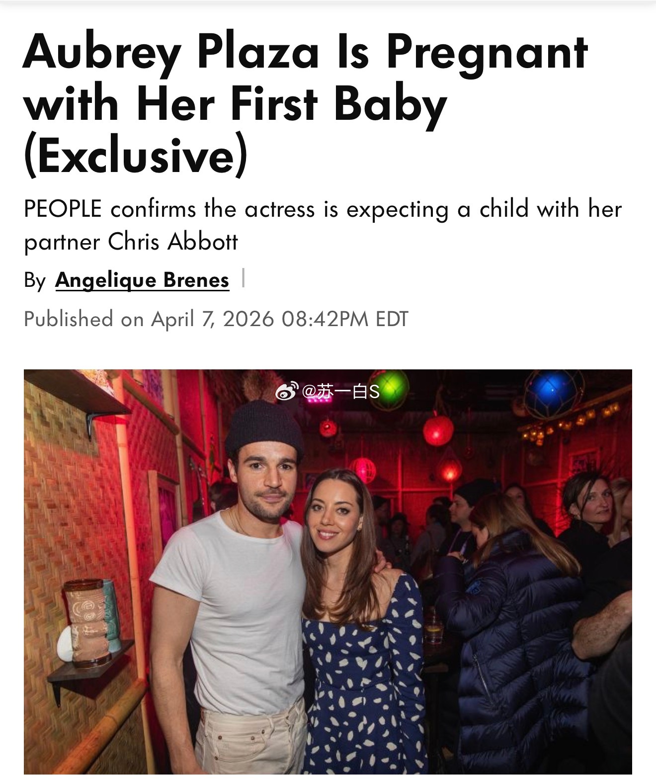 女演员Aubrey Plaza怀孕了,即将跟现任伴侣Chris Abbott迎来她的第一个孩子,预产期在今年秋天 👇