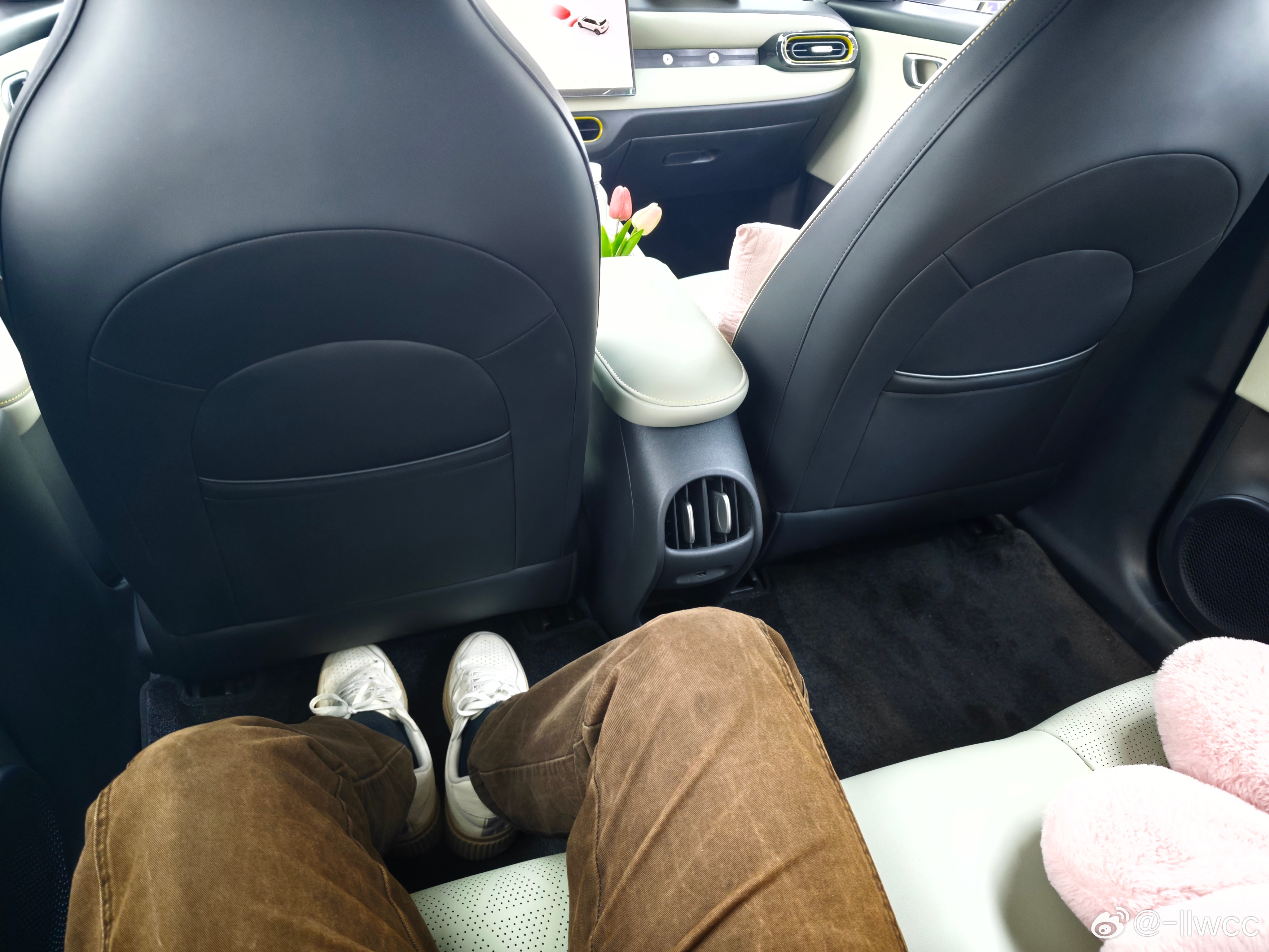 靠背角度也很正常,但地板高度略高,坐进去会有一点蹲板凳的体感,坐垫长度也不够长,我的腿已经不算长了,但它也只能将将托住我的大腿。前排座椅由于椅形的问题,坐垫延伸区域的宽度不够,如果想得到比较好的腿部承托,就不能把大腿打开的太过放肆。