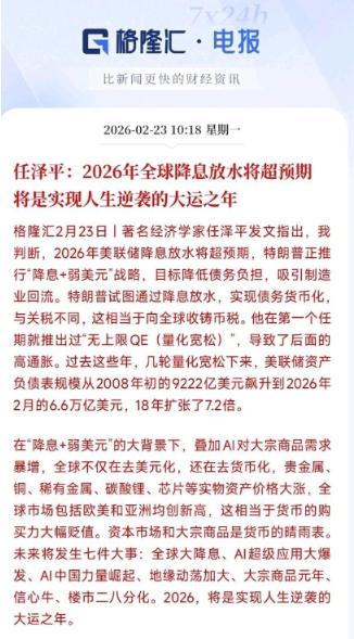 经济学家任泽平认为,2026年将是资本市场集中放水的一年,普通人想守住财富,就得尽快把现金换成能抗通胀的资产。市场的资金量正在急速增加,钱越来越不值钱,这已经不是预测,而是正在发生的现实。