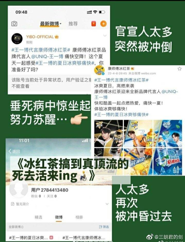 2022年4月8日康师傅冰红茶官宣王一博盛况空前,因访问人数太多官博崩了![笑哭]垂死病中惊坐起,官博醒过来发了一条购物链接后又晕了过去。 死去活来几回,最后官博发了一条“已崩,勿催”。 [大笑] 直播间也被挤爆了。