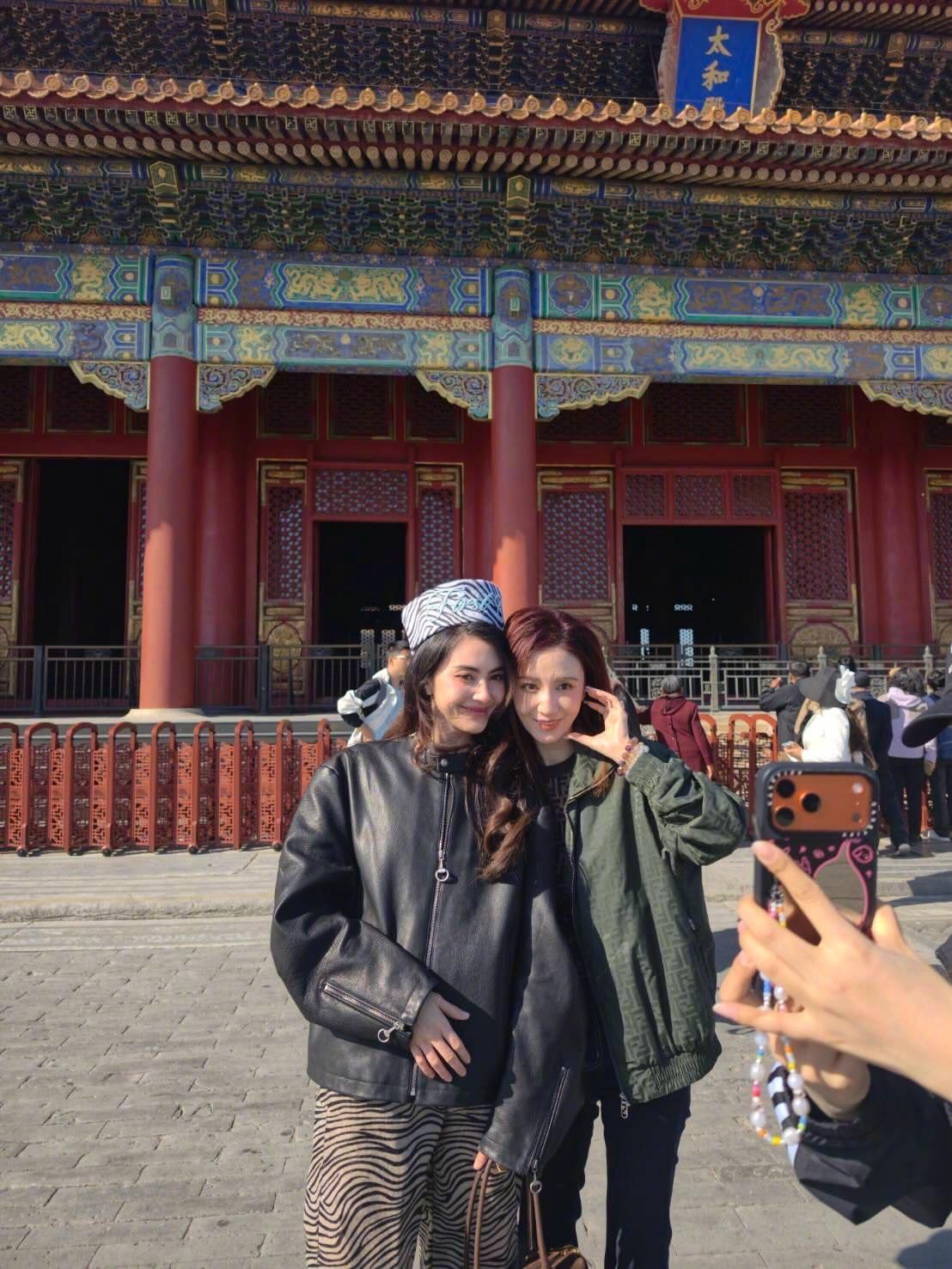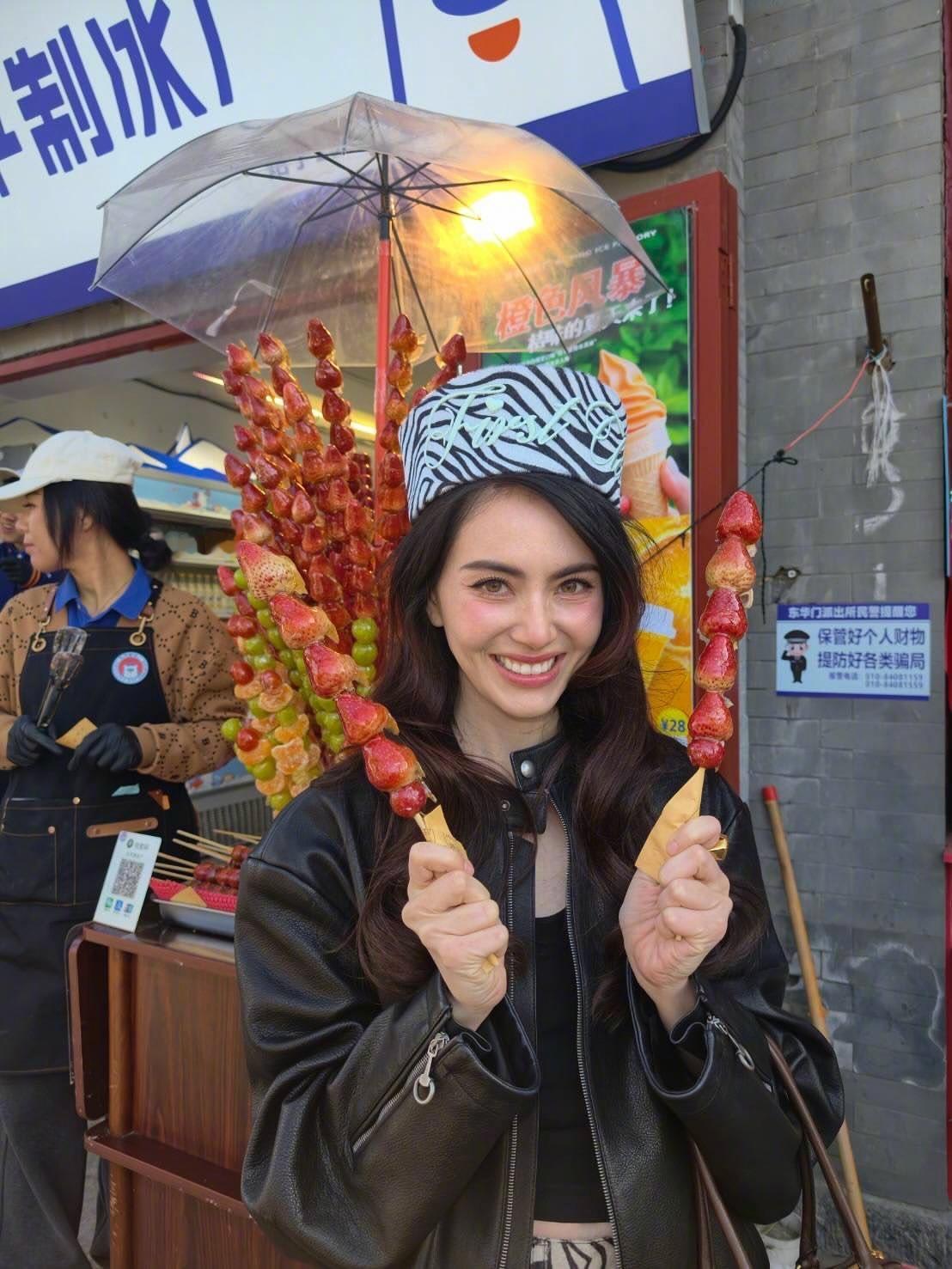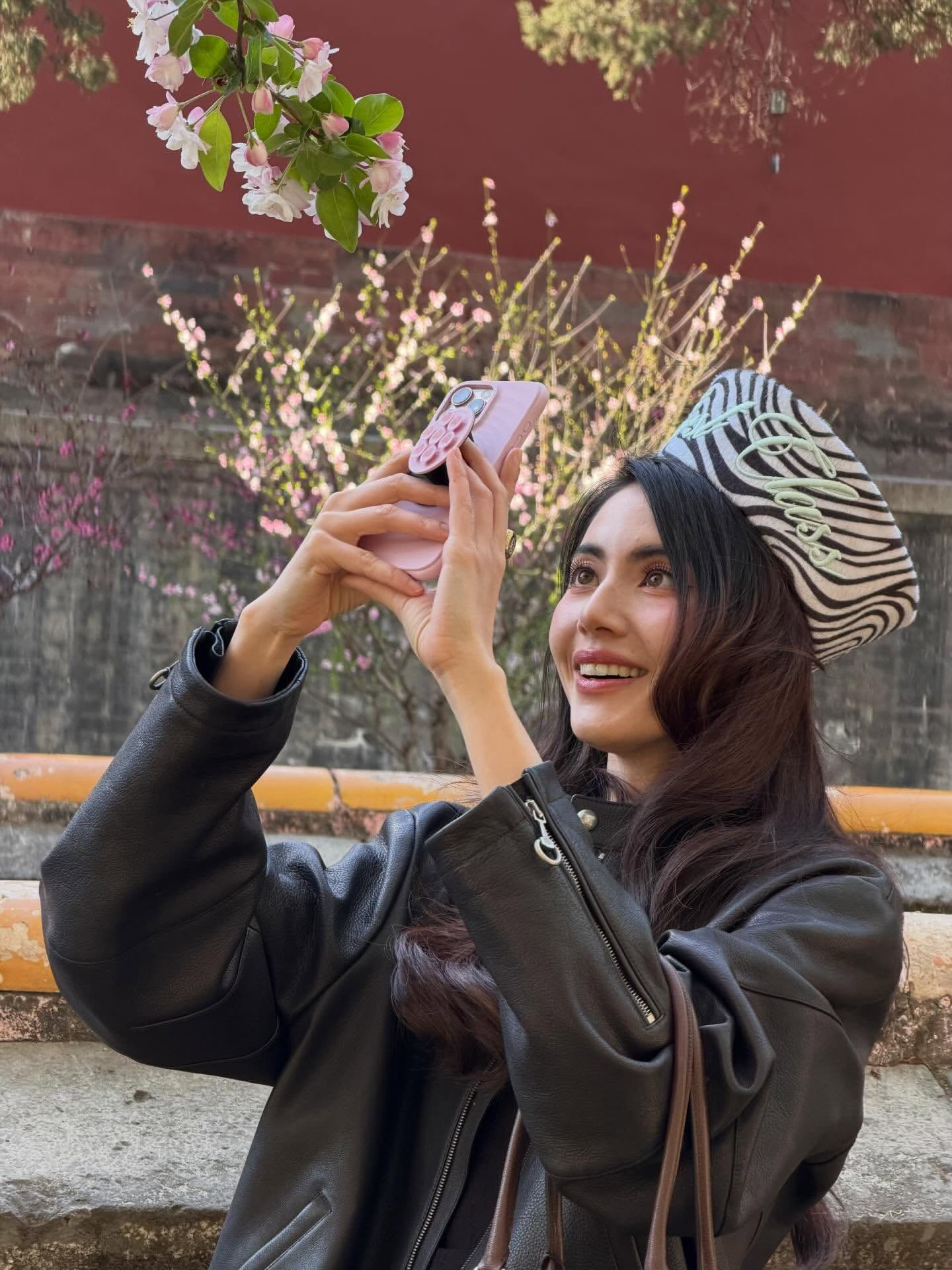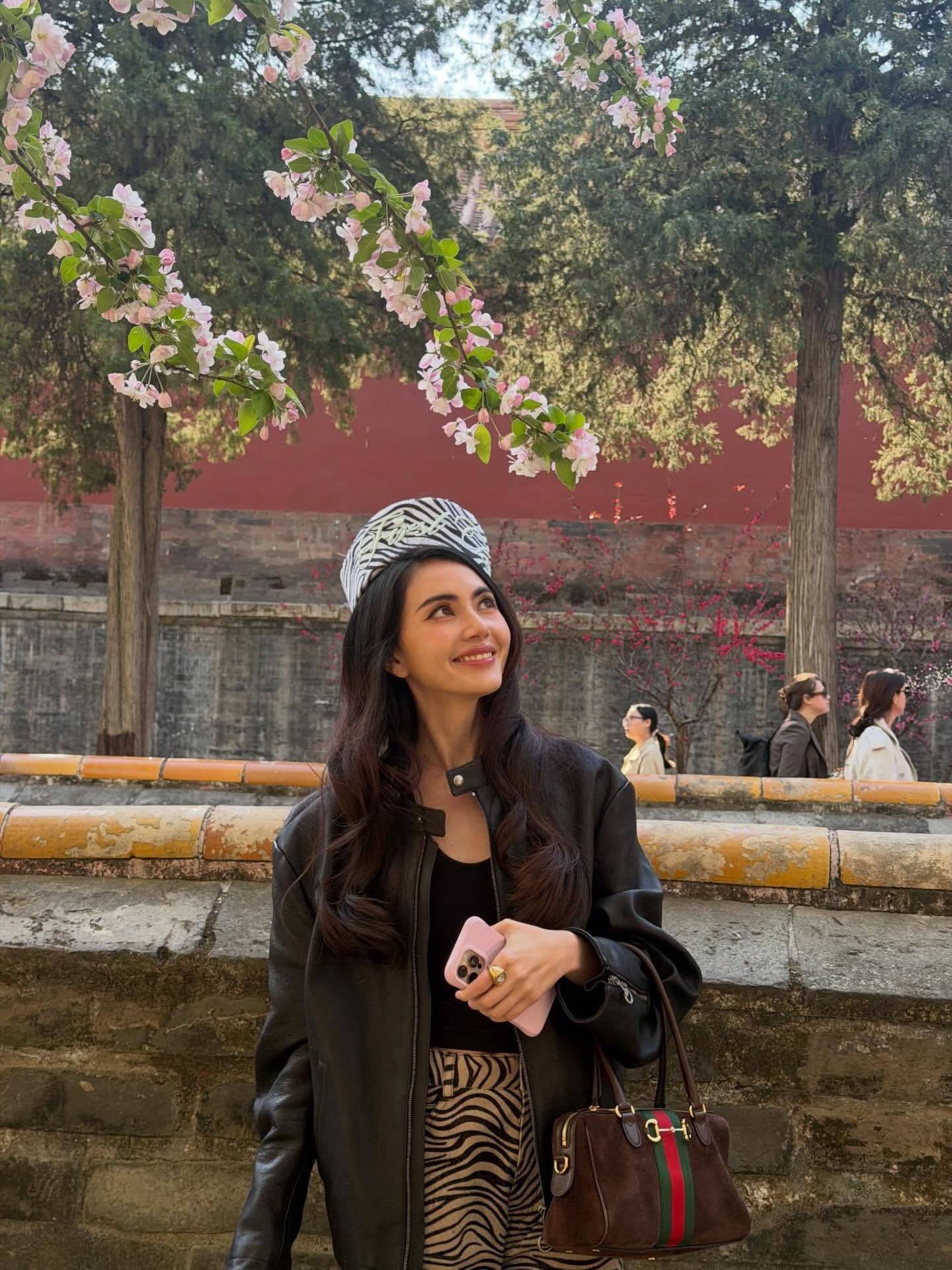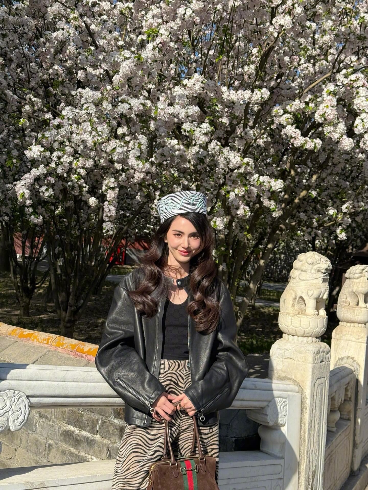 泰国女星Mai在北京,皮衣、包包都是Gucci,帽子配搭的很有特色。去了故宫、看了海棠、樱花🌸、吃了冰糖葫芦。这外卖水煮鱼是龙人居的吗? 米拉服饰解析
