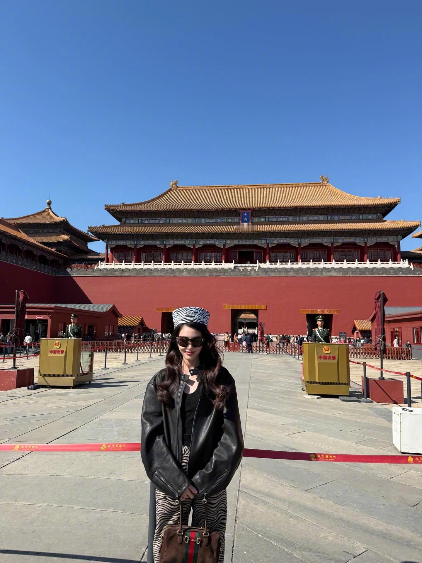 泰国女星Mai在北京,皮衣、包包都是Gucci,帽子配搭的很有特色。去了故宫、看