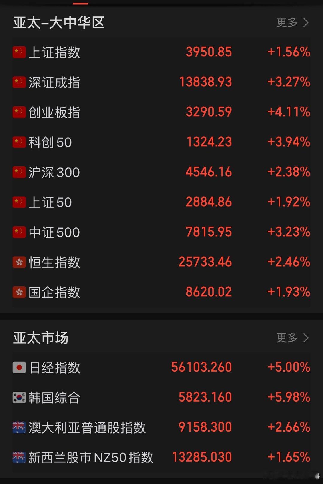愿世界和平!资本市场代表了老百姓的共同心声,亚太股市暴涨!韩国股市又涨到熔断大A也强势放量大涨,个股普涨行情!A股