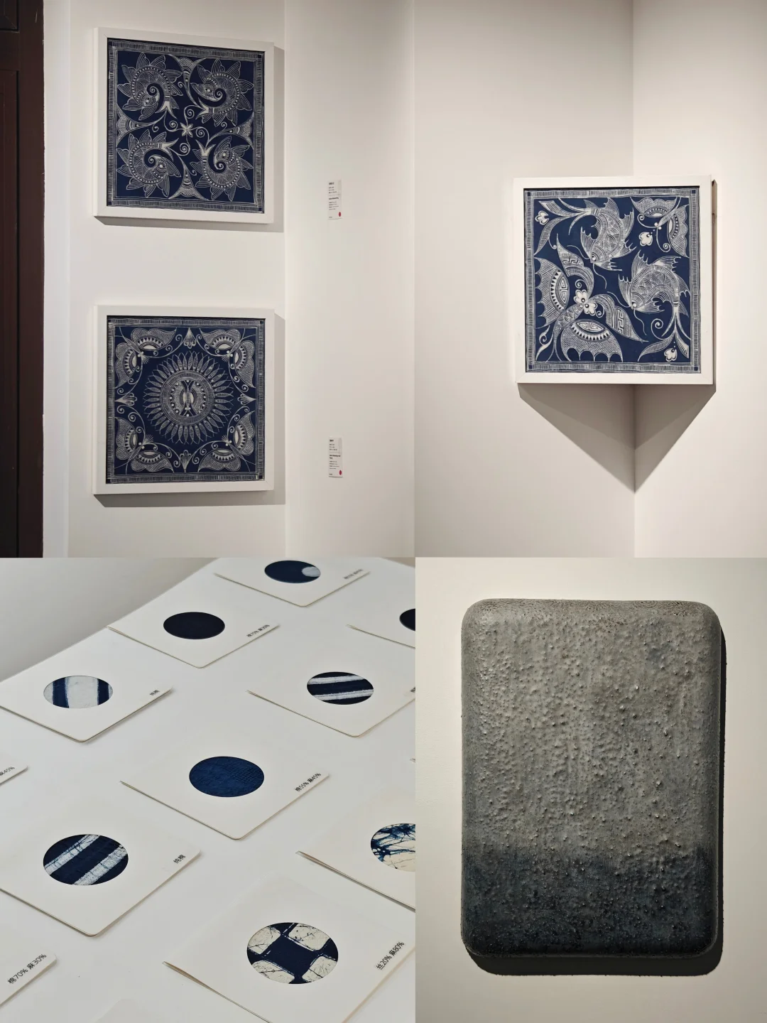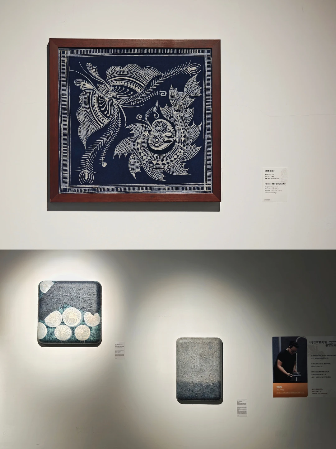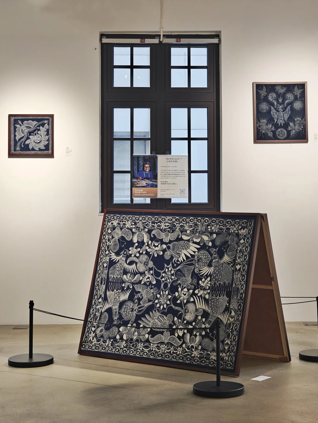 三位排莫蕞后一代原生画娘,州级传承人,仍恪守"画蜡不画稿"的古老信条,仅凭世代传承的肌体记忆即兴创作。(展览中除了蓝染成品,还能看到黑蜡直接在棉布上绘制的原蜡作品。)