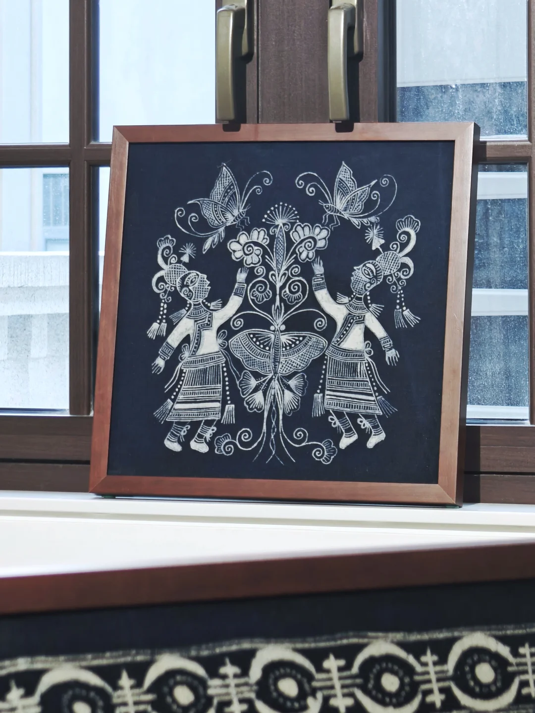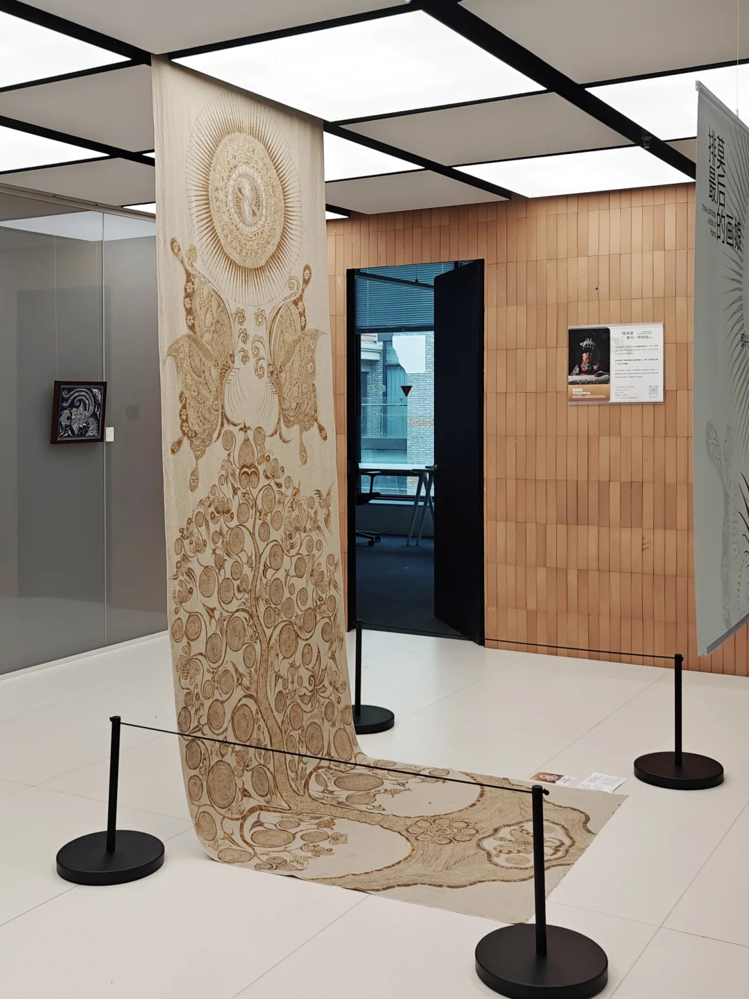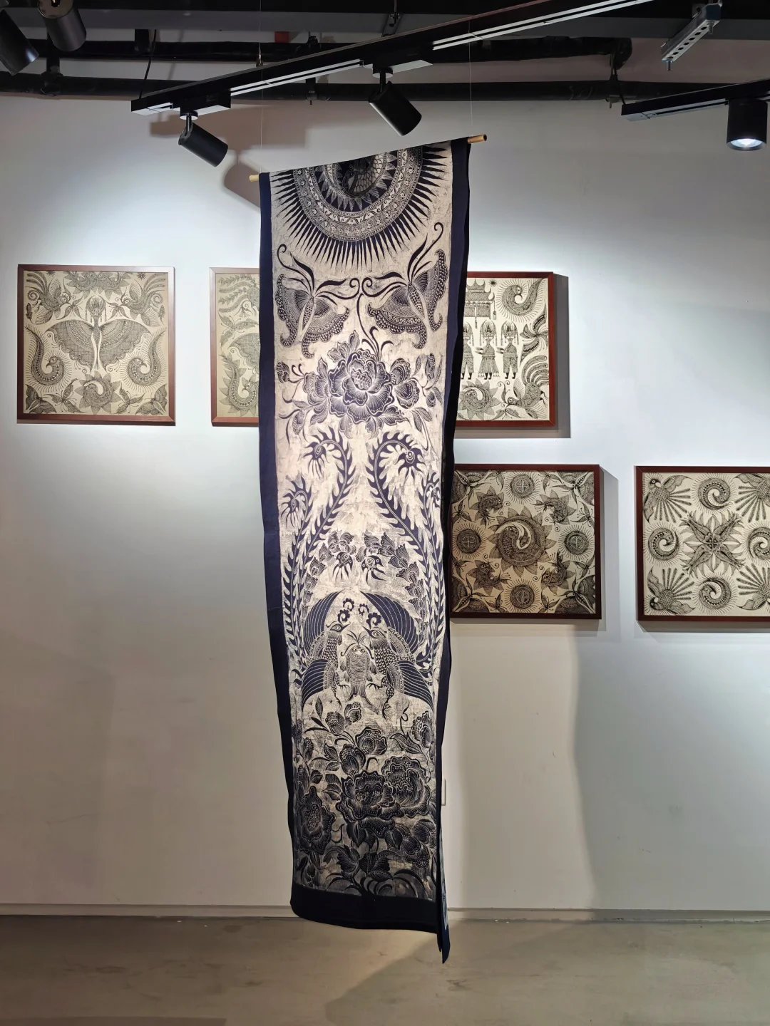 三位排莫蕞后一代原生画娘,州级传承人,仍恪守"画蜡不画稿"的古老信条,仅凭世代传承的肌体记忆即兴创作。(展览中除了蓝染成品,还能看到黑蜡直接在棉布上绘制的原蜡作品。)