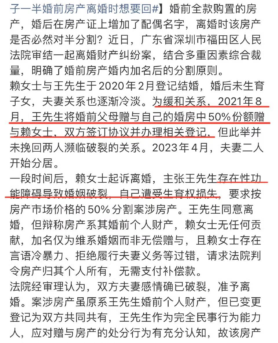 婚前房产婚后加名,离婚时可不一定能对半分。就像深圳福田法院判的这起案子,王先生把