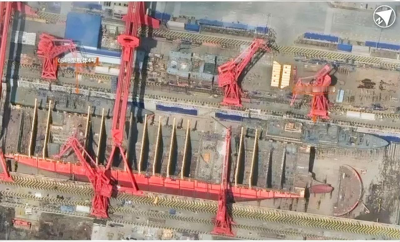 右侧标注的是054B型3号舰,左侧是4号舰,两艘舰都已完成了船体主甲板以下的分段合拢,正在进行上层建筑分段的吊装,很明显3号舰的建造进度快于4号舰。