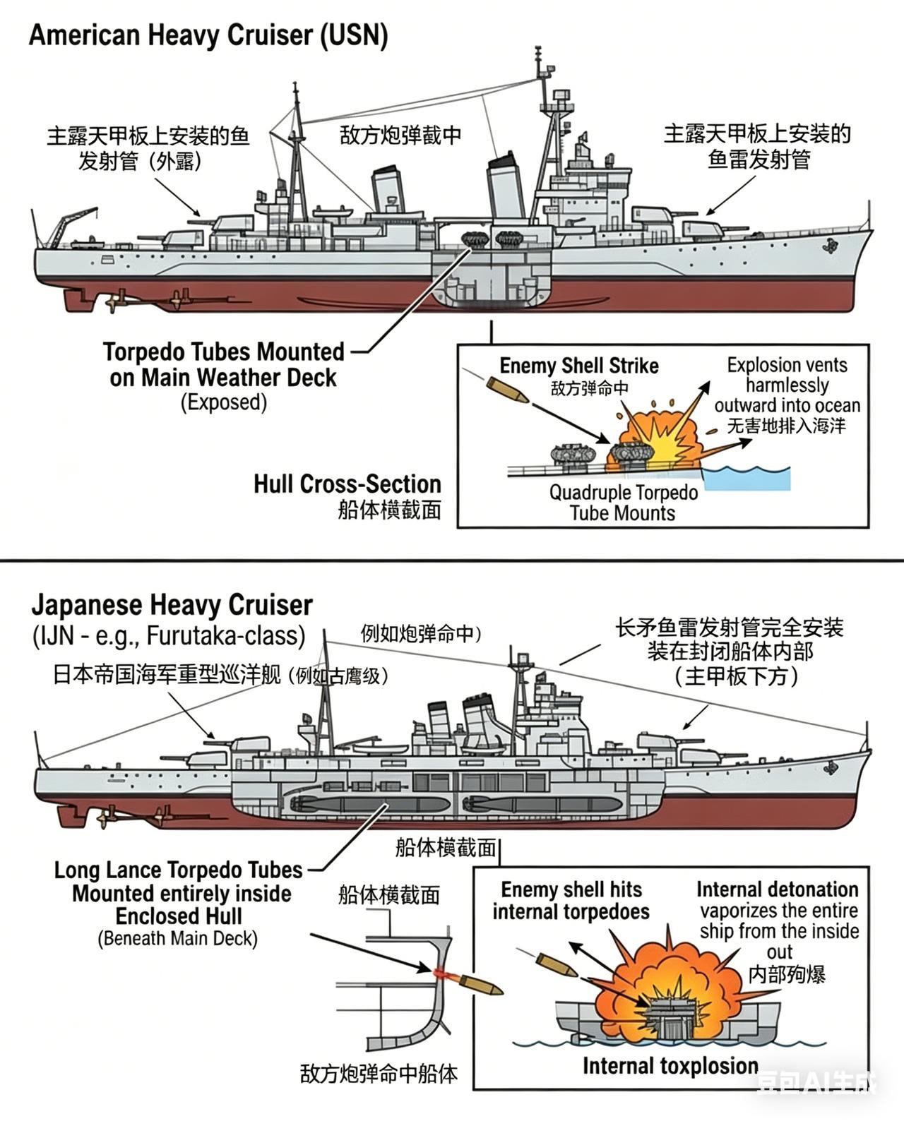 一边是看似危险、实则保命的露天布置,一边是追求完美、却招致命伤的封闭布置,小小的鱼雷放置方式,直接体现了美日海军的作战思路,也在二战战场上,改写了无数巡洋舰的命运。