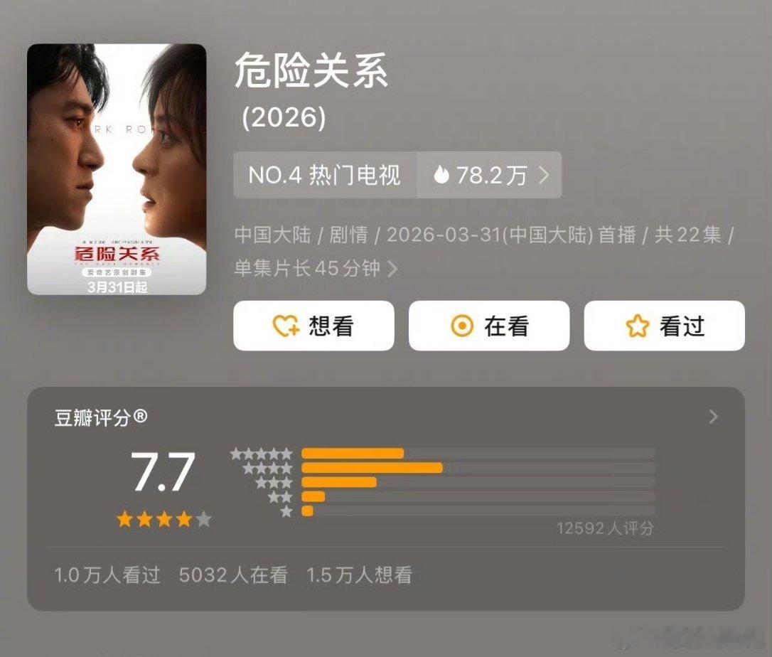 孙俪、吴慷仁领衔主演的《危险关系》豆瓣开分7.7,孙俪每次的演技我都会被震撼到,完全就是在欣赏艺术你们看了这部剧了嘛?觉得7.7分是高了还是低了?