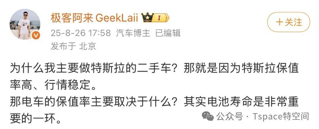 博主补充表示,电池寿命正是纯电车保值率高、行情稳定的核心,而特斯拉在这一方面具备明显优势。