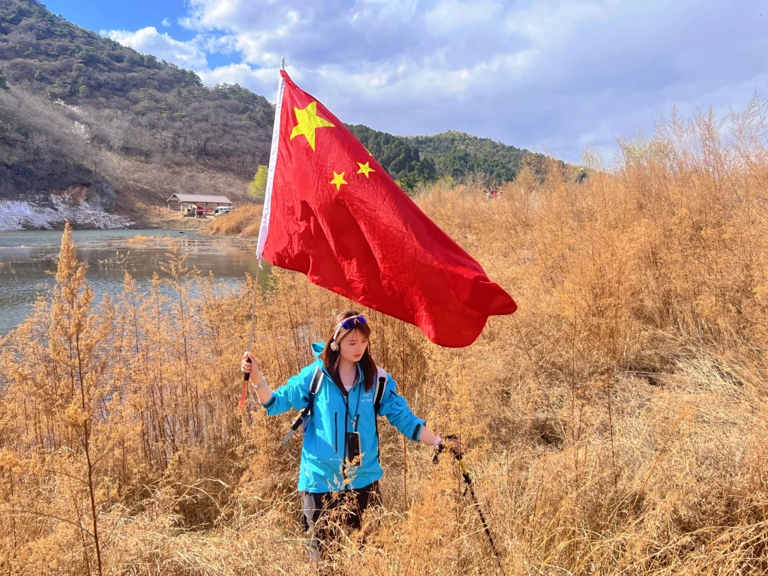 - 看到有小姐姐举着红旗拍照🇨🇳,跟着蹭了张合影,瞬间有了“徒步山河”的仪式感