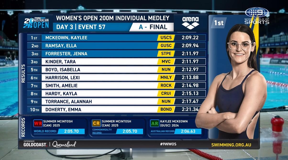 澳大利亚游泳公开赛 女200仰决赛Kaylee 2:09.22Ramsay 2: