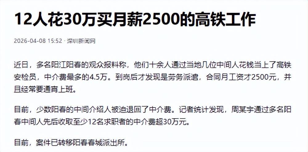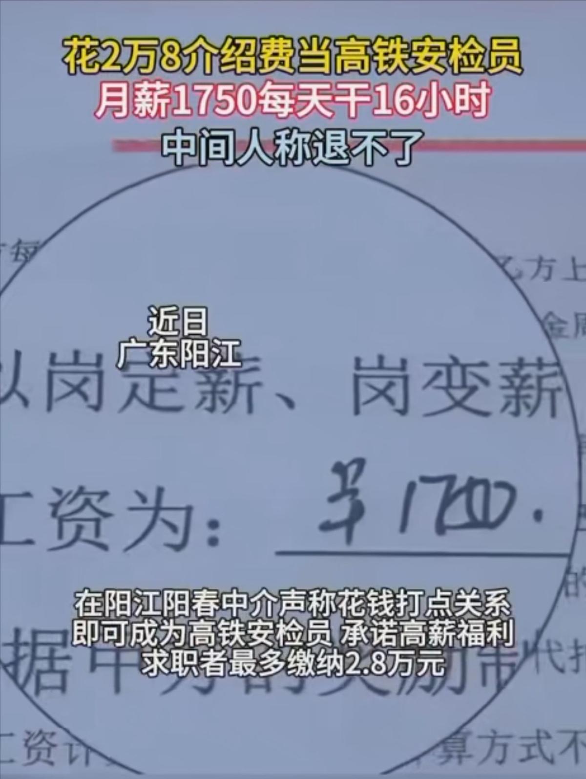 真是离谱又扎心!广东阳春12人竟砸30万中介费,买来月薪2500、还要通宵熬的高铁劳务派遣岗!12个家庭,少则2.5万、多则4.5万,东拼西凑甚至借钱,就为中介嘴里“铁路正式岗、稳定又体面”的铁饭碗。