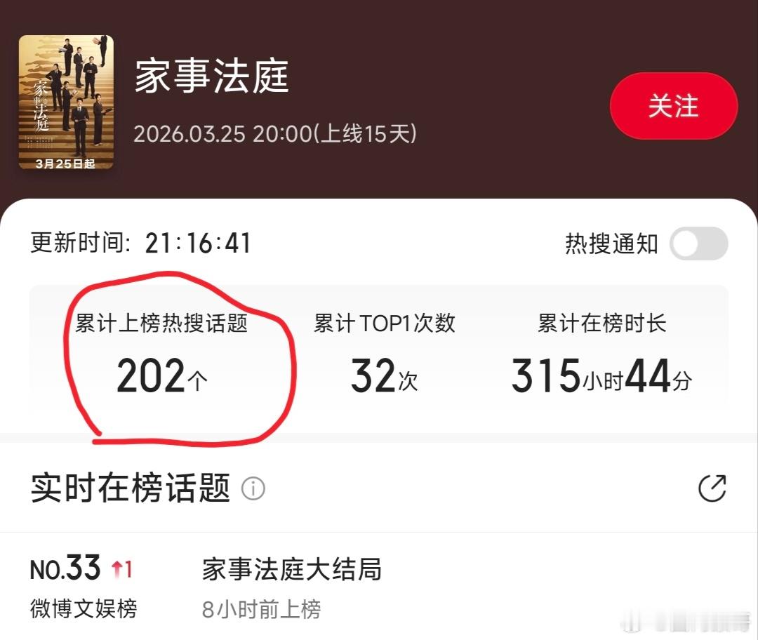 我没看错吧?龚俊的家事法庭今天都点映大结局了,全网热搜才推了202个!比普通的大剧低了5倍以上,太可怜了,全靠自然热度让观众看到但即使这样也是拿到了上周cvb电视剧收视冠军!