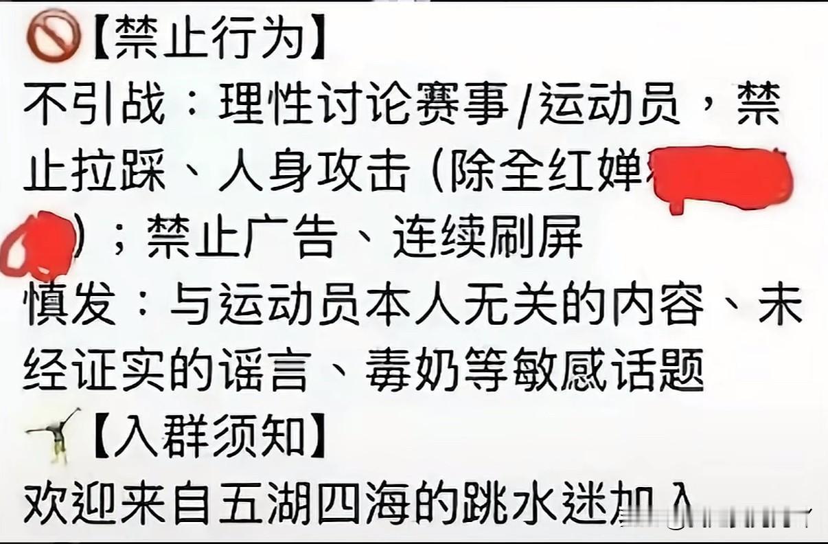 由香港媒体曝光的一个水花征服者联盟wx群,群里282人。群公告写着:禁止攻击运动员,全红婵除外