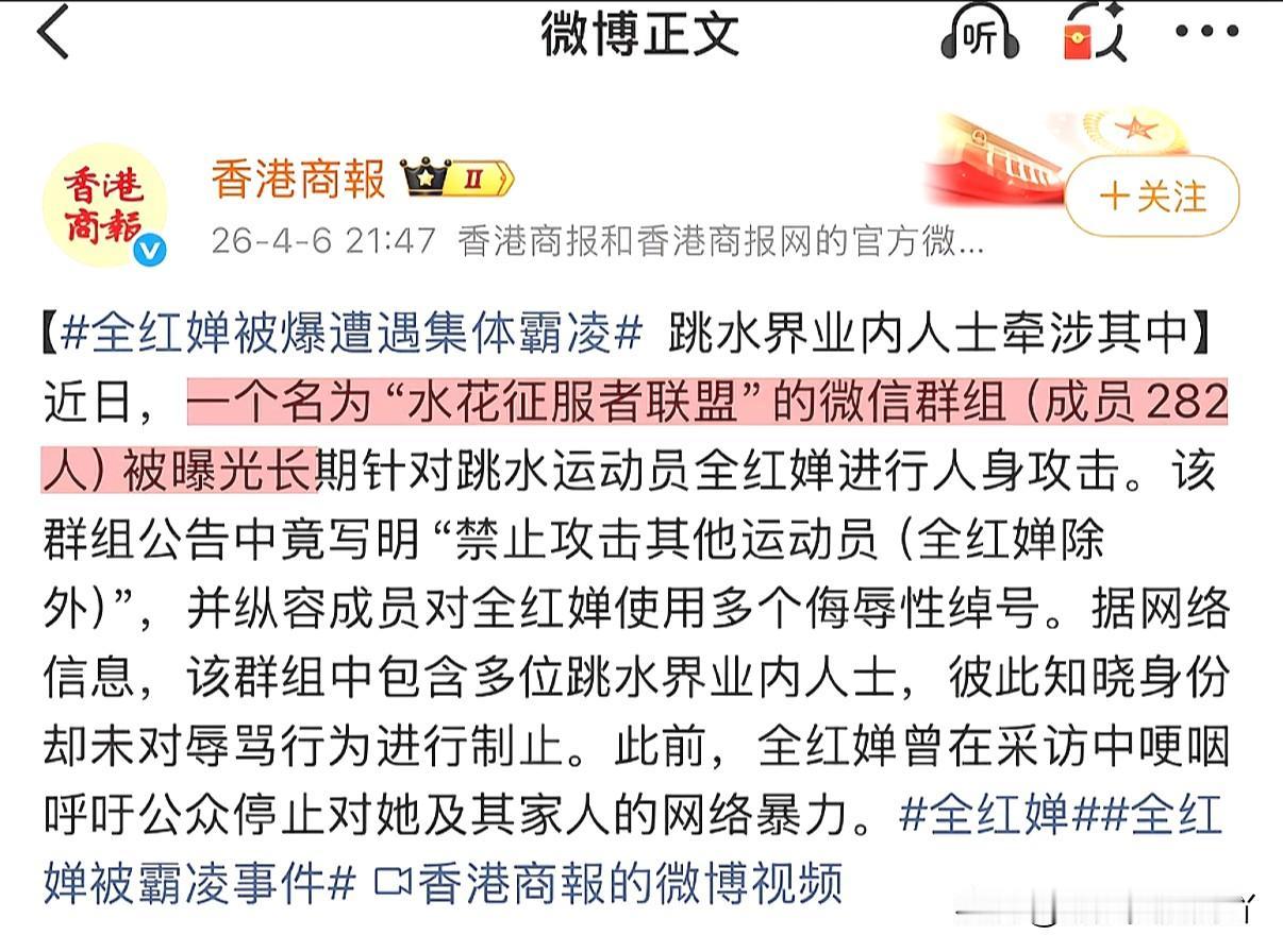 群里长期用各种人身攻击的话辱骂全红婵,包括取与动物相关的外号。面对霸凌谩骂全红婵面对采访只能哽咽的说请你们不要再骂我了,也不要再骂我的家人和朋友了