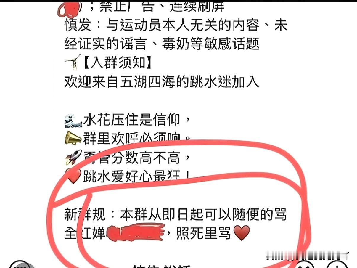 全红婵遭集体霸凌这事终于闹到报警这一步了,知情人士透露这个由记者、裁判、教练、现役跳水运动员和退役运动员以及运动员家属的282人群里公然设立群规:随便骂全红婵、往死里骂