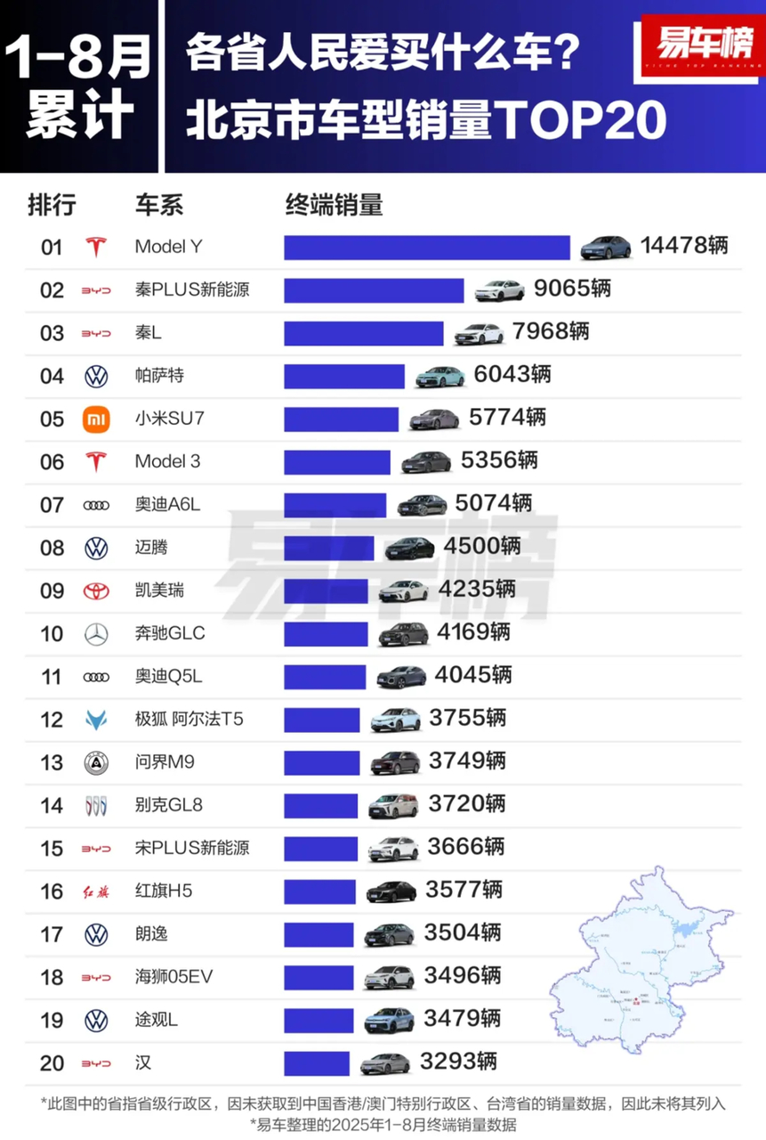 在易车发布的2025年1~8月北京市车型销量排行榜中,特斯拉Model Y位居榜首。