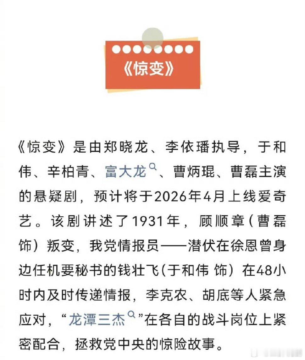 由郑晓龙、李依璠执导,主演的悬疑剧《惊变》开启招商,4月CCTV1即将播出,爱奇艺全网独播!