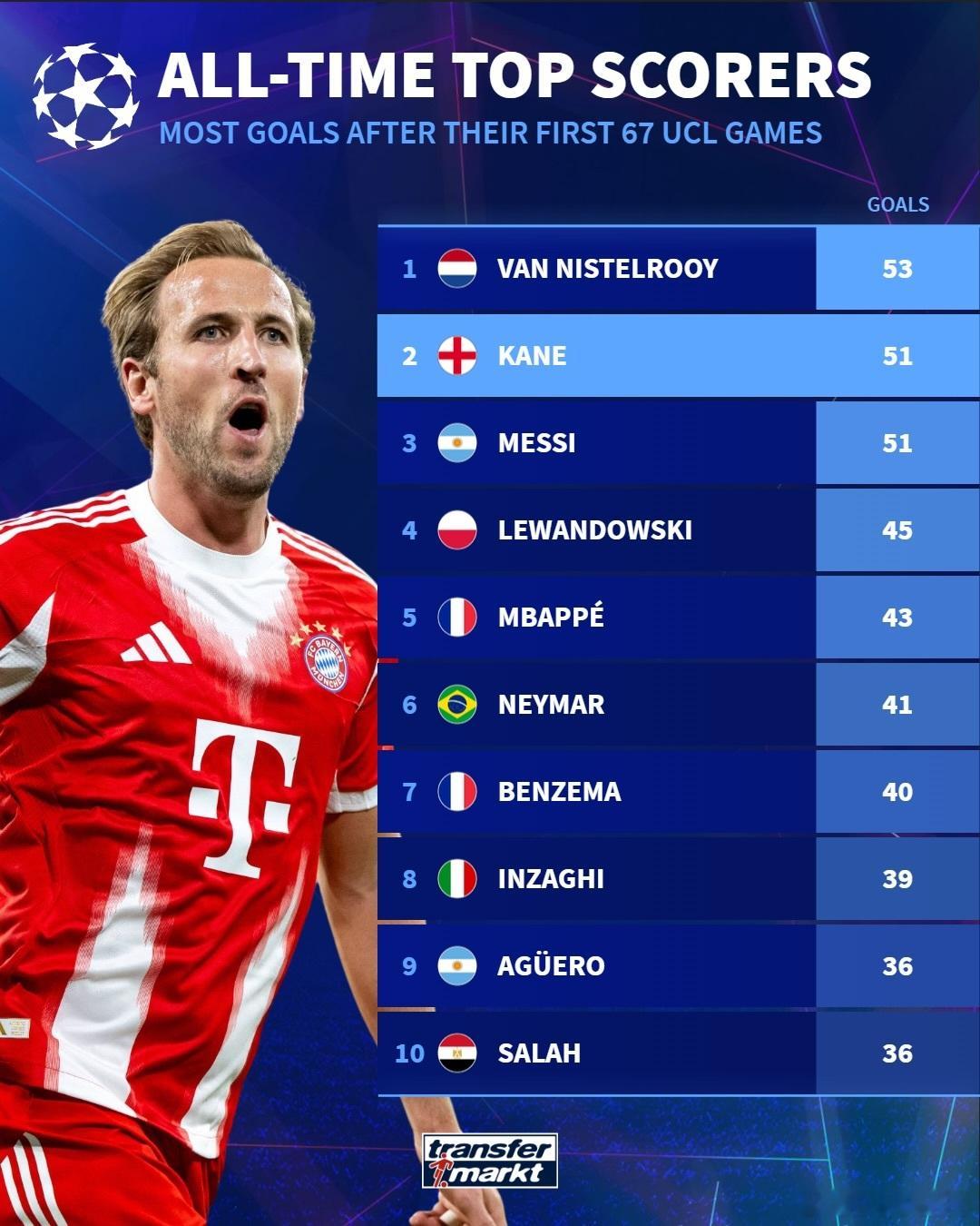 🚨[德國轉會市場網站]:在歐冠聯賽的前67場比賽中,只有魯德·范尼斯特魯伊的進球數比哈利·凱恩更多 🔥🔥🔥🏴