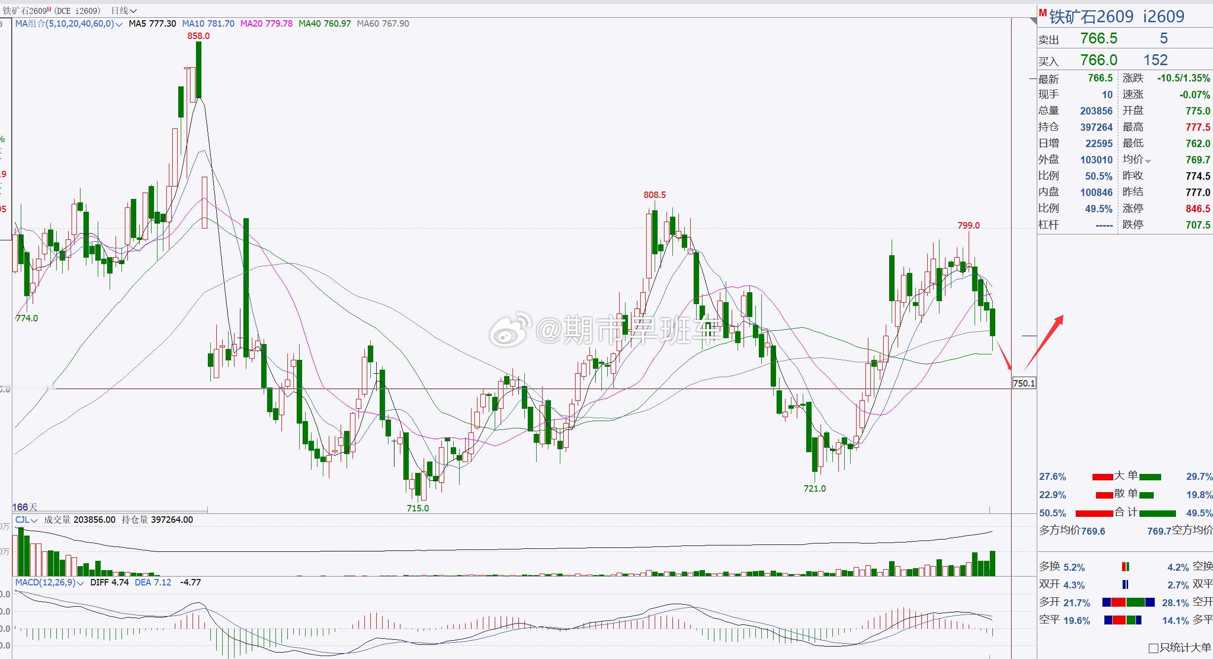 3、【铁矿石2609】铁矿石短期关注750一带!铁矿石目前伴随着回踩调整,后市建议关注750整数一带,若此位置未能跌破延续,建议短线偏多,看短期反弹修正;稳健者建议先观望;例如多关注758—755附近,上方先关注785附近;突破再关注800附近;空关注785、800这两个位置再择机考虑介入;(建议仅供参考,具体操作以开盘点位实时跟进,据此操作风险自担)焦煤螺纹铁矿石