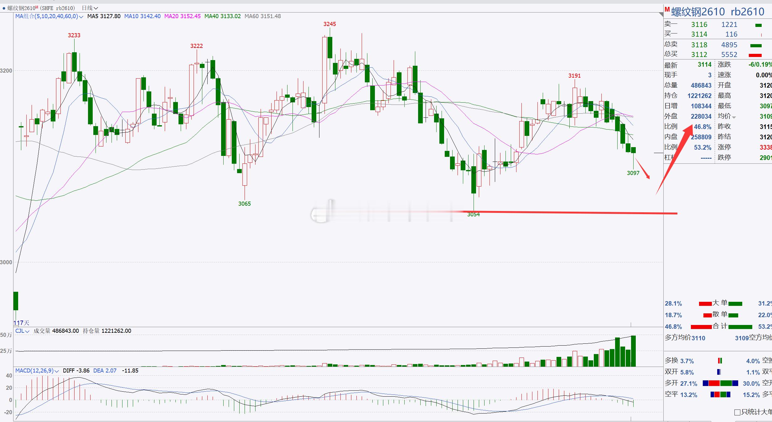 2、【螺纹2610】螺纹关注3050支撑!螺纹目前更换主力合约了,行情处于回踩调整阶段,后市重点关注3050一带,也是前夕低点,若此位置未能跌破延续,建议短线偏多,看短期反弹修正,但不过分看空间;稳健者建议先观望;例如多关注3080—3060附近,上方先关注3150附近,突破再关注3200附近;空关注3200、3150这两个位置再择机考虑介入;(建议仅供参考,具体操作以开盘点位实时跟进,据此操作风险自担)